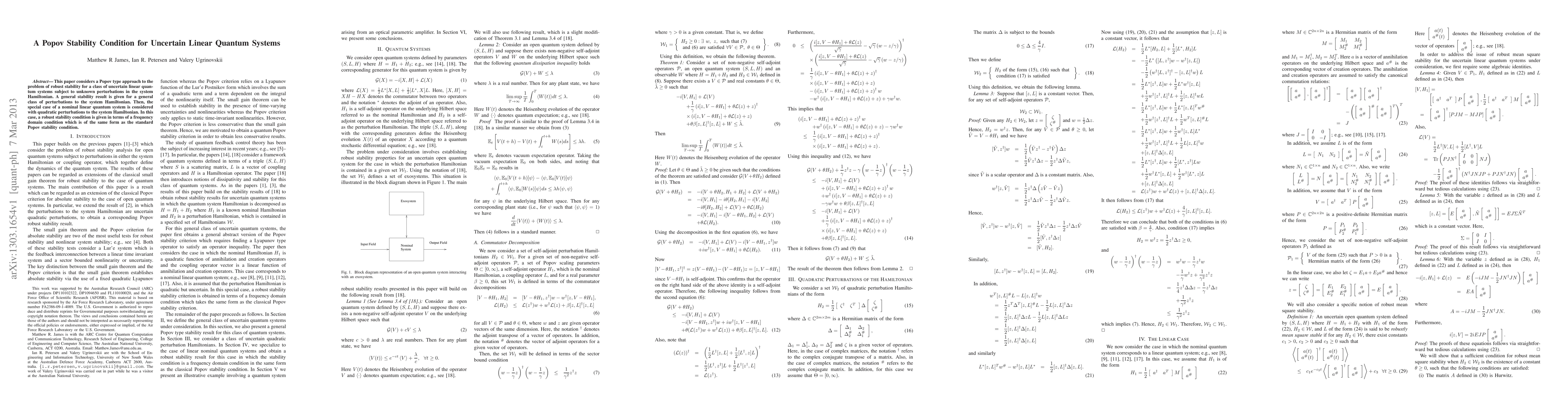 This paper proposes a Popov stability condition for uncertain linear quantum systems, ensuring robust stability against unknown perturbations in the system Hamiltonian. It extends the standard Popov stability condition to the quantum domain for systems with quadratic perturbations.