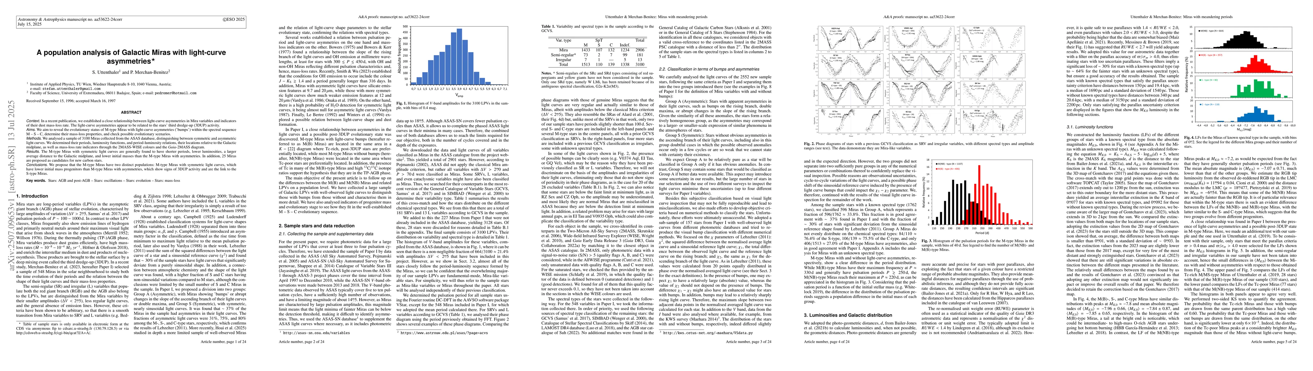 Context: In a recent publication, we established a close relationship between light-curve asymmetries in Mira variables and indicators of their dust mass-loss rate. The light-curve asymmetries appear to be related to the stars' third dredge-up (3DUP) activity. Aims: We aim to reveal the evolutionary status of M-type Miras with light-curve asymmetries ('bumps') within the spectral sequence M -- S -- C, determine their mass-loss properties, and check possible evolutionary scenarios. Methods: We analysed a sample of 3100 Miras collected from the ASAS database, distinguishing between symmetric and asymmetric light curves. We determined their periods, luminosity functions, and period-luminosity relations, their locations relative to the Galactic midplane, as well as mass-loss rate indicators through the 2MASS-WISE colours and the Gaia-2MASS diagram. Results: The M-type Miras with symmetric light curves are generally found to have shorter periods, lower luminosities, a larger average distance to the Galactic midplane, and lower initial masses than the M-type Miras with asymmetries. In addition, 25 Miras are proposed as candidates for new carbon stars. Conclusions: We propose that the M-type Miras have two distinct populations: M-type Miras with symmetric light curves, which have lower initial mass progenitors than M-type Miras with asymmetries, which show signs of 3DUP activity and are the link to the S-type Miras.