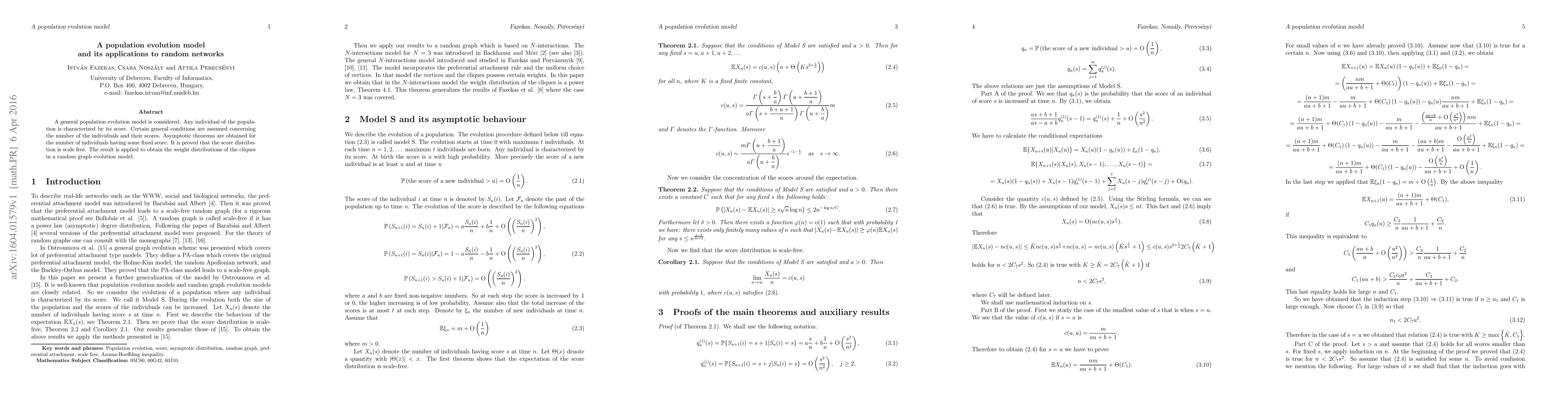 A general population evolution model is considered. Any individual of the population is characterized by its score. Certain general conditions are assumed concerning the number of the individuals and their scores. Asymptotic theorems are obtained for the number of individuals having some fixed score. It is proved that the score distribution is scale free. The result is applied to obtain the weight distributions of the cliques in a random graph evolution model.