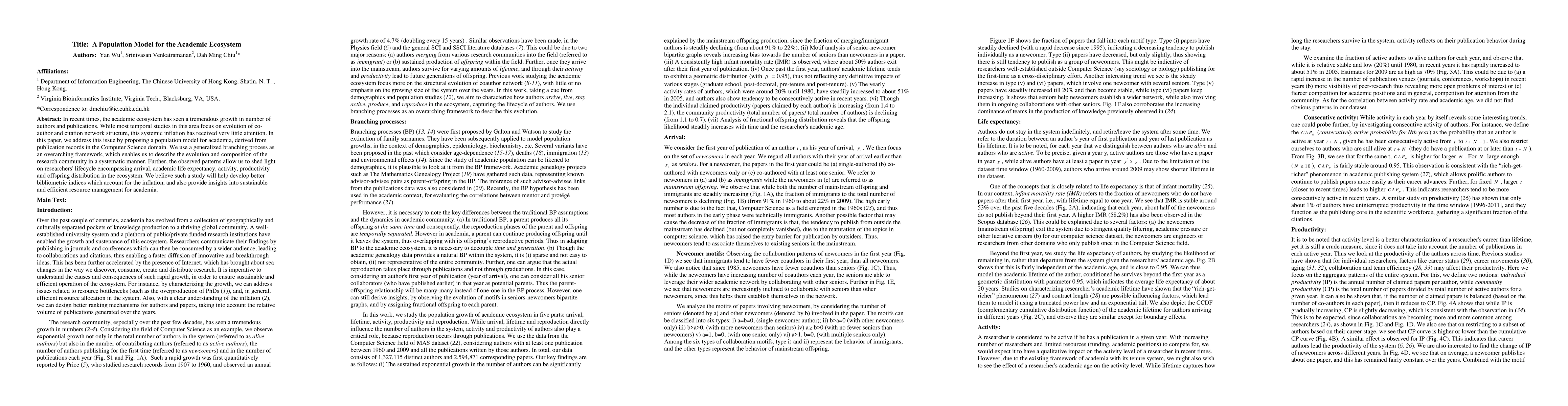 In recent times, the academic ecosystem has seen a tremendous growth in number of authors and publications. While most temporal studies in this area focus on evolution of co-author and citation network structure, this systemic inflation has received very little attention. In this paper, we address this issue by proposing a population model for academia, derived from publication records in the Computer Science domain. We use a generalized branching process as an overarching framework, which enables us to describe the evolution and composition of the research community in a systematic manner. Further, the observed patterns allow us to shed light on researchers' lifecycle encompassing arrival, academic life expectancy, activity, productivity and offspring distribution in the ecosystem. We believe such a study will help develop better bibliometric indices which account for the inflation, and also provide insights into sustainable and efficient resource management for academia.