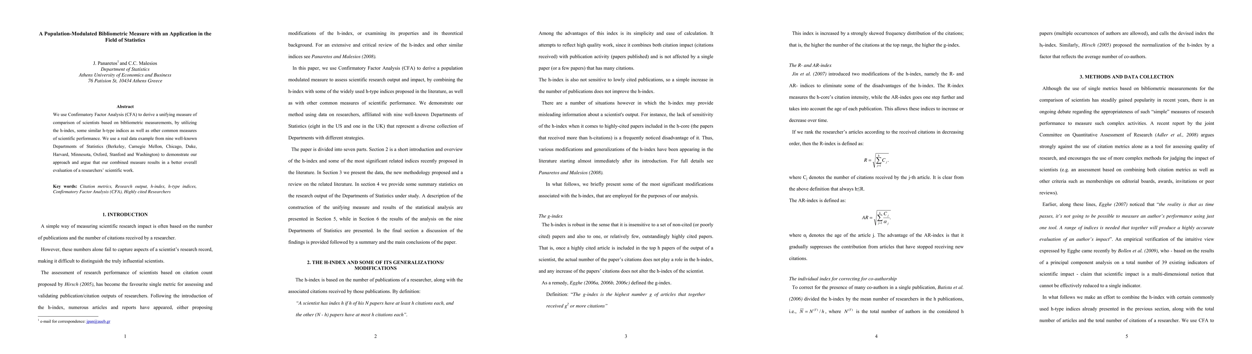 This paper proposes a new bibliometric measure combining the h-index and other performance metrics, validated using confirmatory factor analysis. The approach is demonstrated on data from nine statistics departments, showing improved evaluation of researchers' scientific contributions.