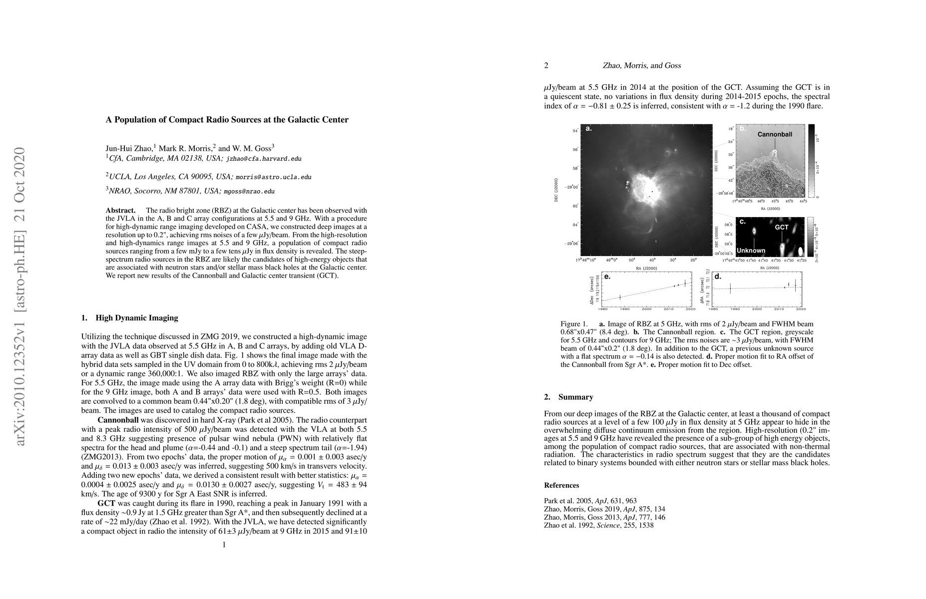 This paper reports the discovery of a population of compact radio sources at the Galactic center using high-resolution imaging from the JVLA. The study identifies steep-spectrum radio sources likely associated with neutron stars or stellar mass black holes, and presents new findings on the Cannonball and Galactic center transient (GCT).