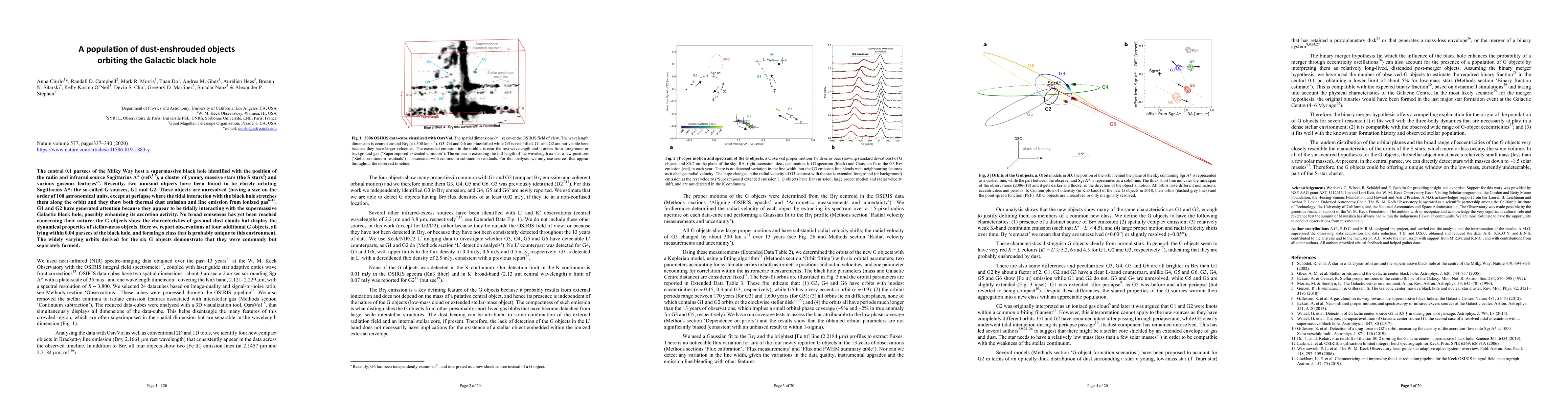 The central 0.1 parsecs of the Milky Way host a supermassive black hole identified with the position of the radio and infrared source Sagittarius A*, a cluster of young, massive stars (the S stars) and various gaseous features. Recently, two unusual objects have been found to be closely orbiting Sagittarius A*: the so-called G sources, G1 and G2. These objects are unresolved (having a size of the order of 100 astronomical units, except at periapse, where the tidal interaction with the black hole stretches them along the orbit) and they show both thermal dust emission and line emission from ionized gas. G1 and G2 have generated attention because they appear to be tidally interacting with the supermassive Galactic black hole, possibly enhancing its accretion activity. No broad consensus has yet been reached concerning their nature: the G objects show the characteristics of gas and dust clouds but display the dynamical properties of stellar-mass objects. Here we report observations of four additional G objects, all lying within 0.04 parsecs of the black hole and forming a class that is probably unique to this environment. The widely varying orbits derived for the six G objects demonstrate that they were commonly but separately formed.
