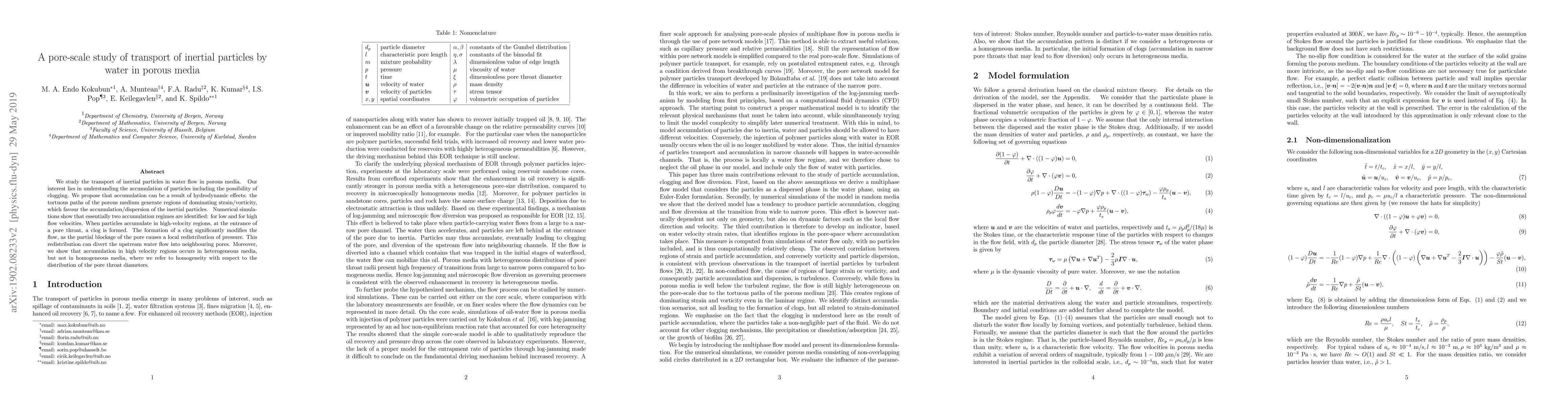 This study investigates the transport of inertial particles in water flow through porous media, identifying two accumulation regimes based on flow velocity. It highlights how hydrodynamic effects in the tortuous paths of the porous medium lead to particle accumulation and potential clogging, particularly in heterogeneous media.