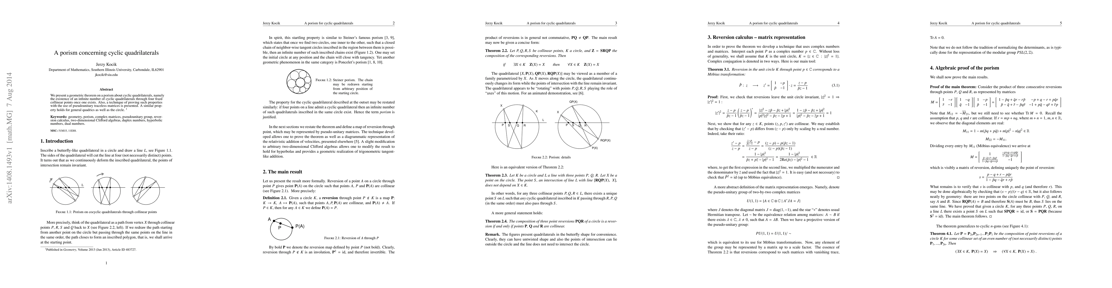 We present a geometric theorem on a porism about cyclic quadrilaterals, namely the existence of an infinite number of cyclic quadrilaterals through four fixed collinear points once one exists. Also, a technique of proving such properties with the use of pseudounitary traceless matrices is presented. A similar property holds for general quadrics as well as the circle.