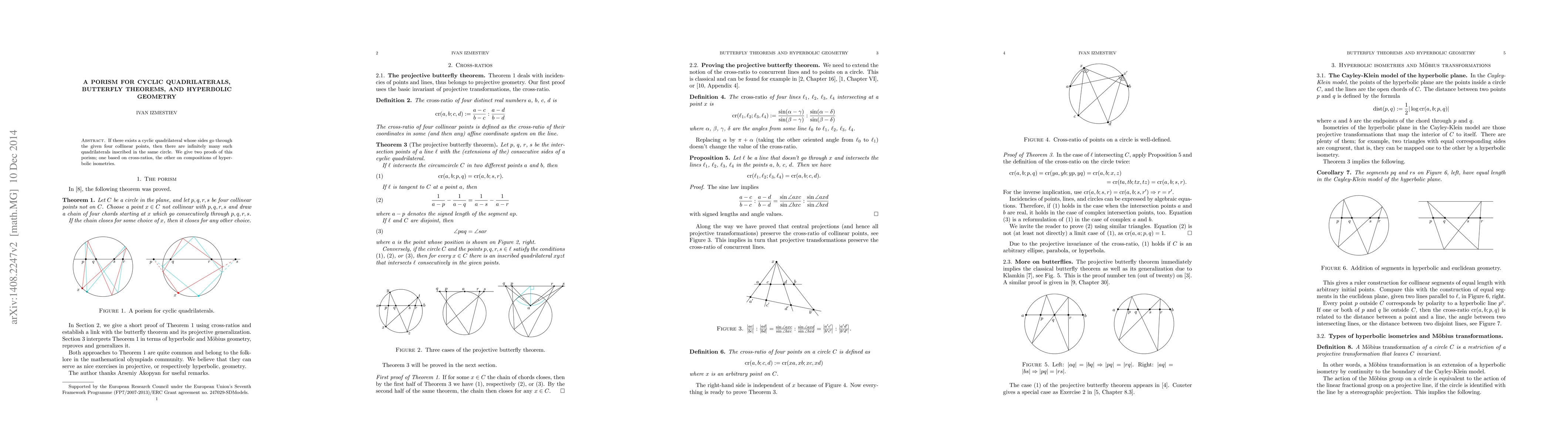 Summary: The paper demonstrates that cyclic quadrilaterals inscribed in a circle can be extended infinitely through given four collinear points, providing two proofs: one using cross-ratios and another leveraging compositions of hyperbolic isometries.
