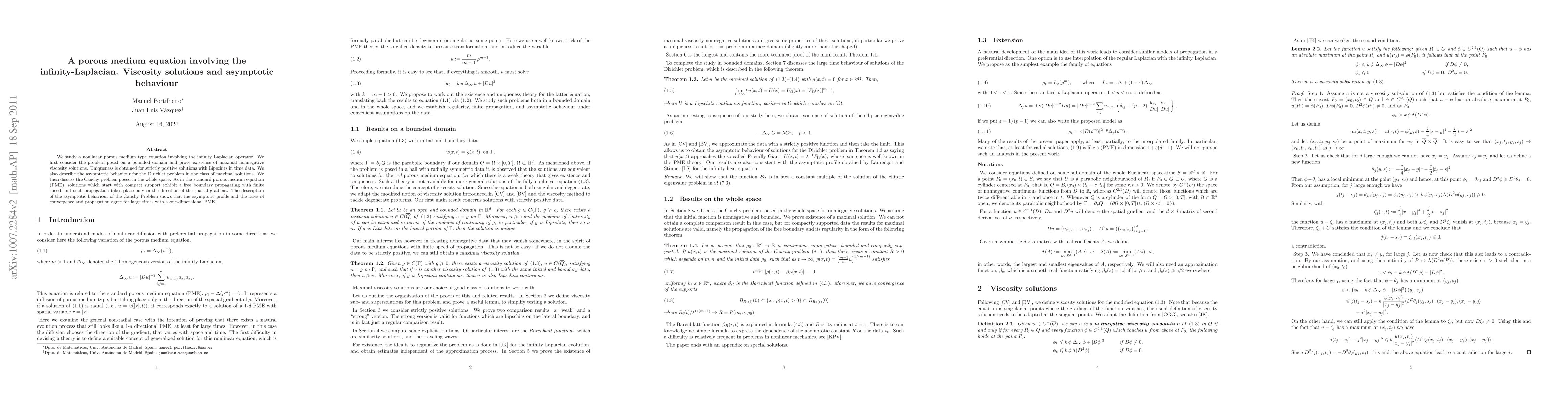 We study a nonlinear porous medium type equation involving the infinity Laplacian operator. We first consider the problem posed on a bounded domain and prove existence of maximal nonnegative viscosity solutions. Uniqueness is obtained for strictly positive solutions with Lipschitz in time data. We also describe the asymptotic behaviour for the Dirichlet problem in the class of maximal solutions. We then discuss the Cauchy problem posed in the whole space. As in the standard porous medium equation (PME), solutions which start with compact support exhibit a free boundary propagating with finite speed, but such propagation takes place only in the direction of the spatial gradient. The description of the asymptotic behaviour of the Cauchy Problem shows that the asymptotic profile and the rates of convergence and propagation exactly agree for large times with a one-dimensional PME.