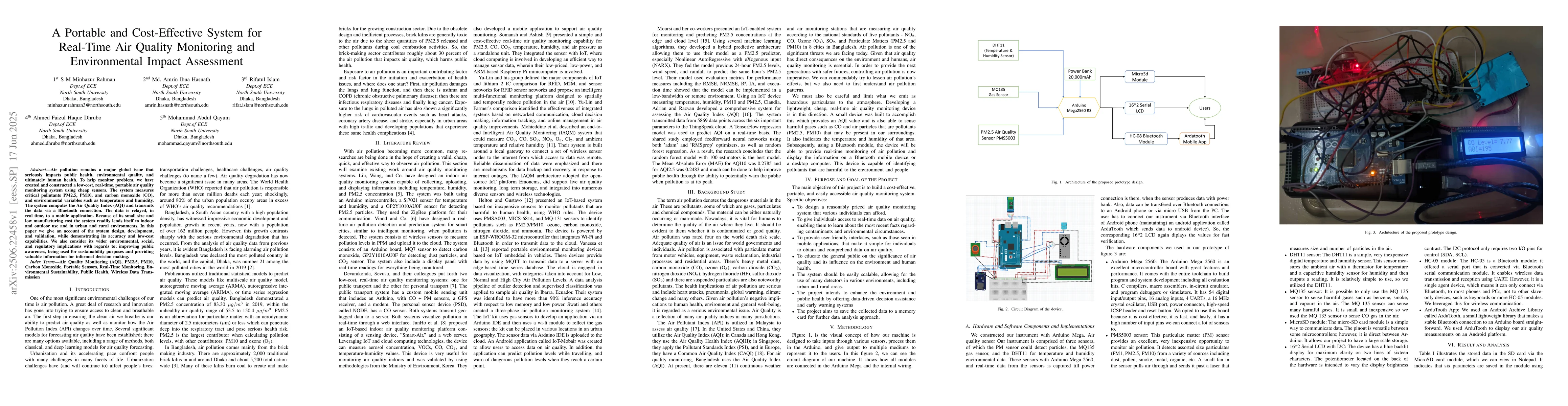 Air pollution remains a major global issue that seriously impacts public health, environmental quality, and ultimately human health. To help monitor problem, we have created and constructed a low-cost, real-time, portable air quality monitoring system using cheap sensors. The system measures critical pollutants PM2.5, PM10, and carbon monoxide (CO), and environmental variables such as temperature and humidity. The system computes the Air Quality Index (AQI) and transmits the data via a Bluetooth connection. The data is relayed, in real time, to a mobile application. Because of its small size and low manufacturing cost the system readily lends itself to indoor and outdoor use and in urban and rural environments. In this paper we give an account of the system design, development, and validation, while demonstrating its accuracy and low-cost capabilities. We also consider its wider environmental, social, and regulatory implications with regards to; improving public awareness, being used for sustainability purposes and providing valuable information for informed decision making.