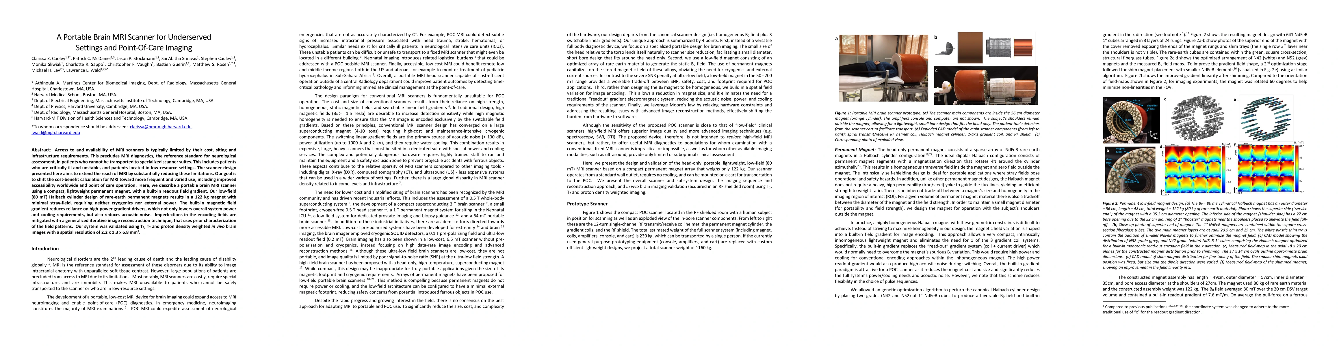 This paper presents a portable brain MRI scanner designed to reduce cost and infrastructure requirements, enabling MRI diagnostics in underserved and low-resource settings. The scanner uses a compact, lightweight permanent magnet and a built-in magnetic field gradient, resulting in minimal stray-field and reduced power and cooling needs.
