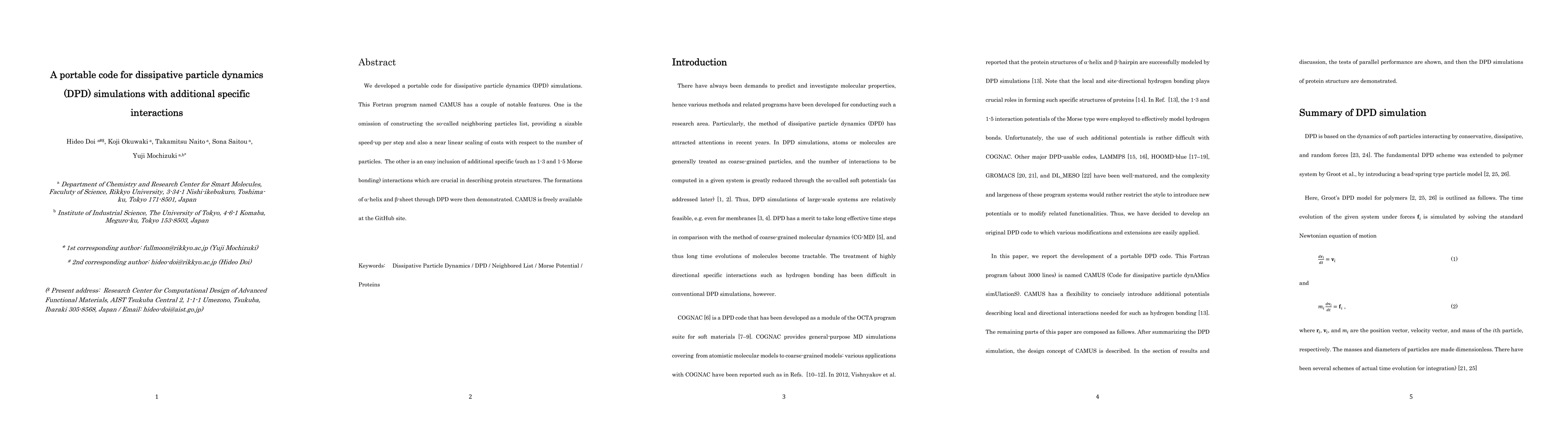 The paper presents CAMUS, a portable Fortran code for efficient dissipative particle dynamics (DPD) simulations, which notably speeds up computations by avoiding the neighboring particles list and supports the inclusion of specific interactions for protein structure modeling. The code is freely available on GitHub.