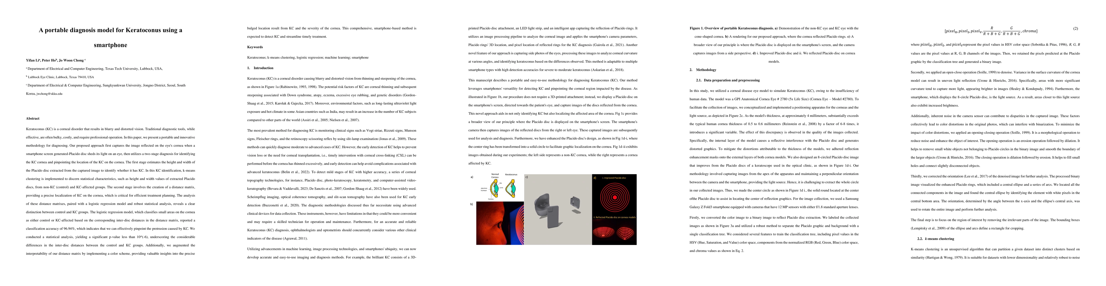 The two-stage diagnostic approach combining k-means clustering and logistic regression for precise KC localization on the cornea using smartphone imagery.