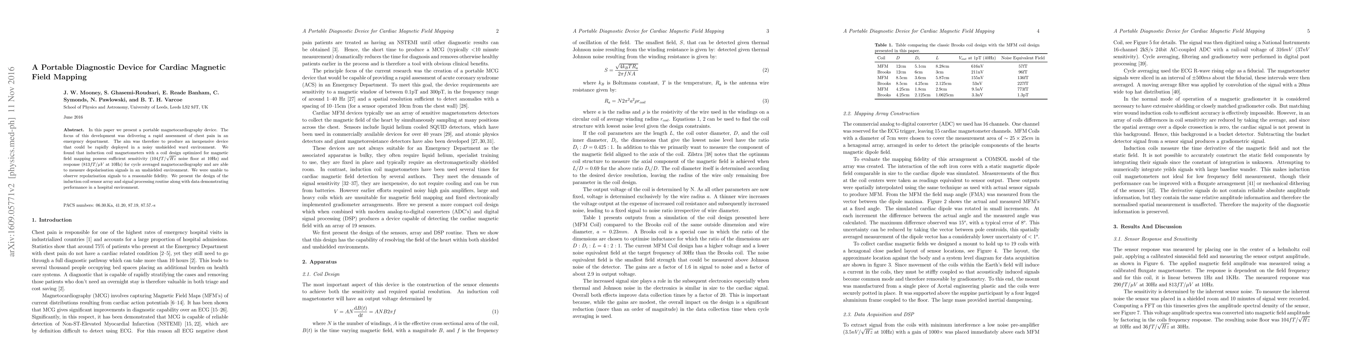 This paper introduces a portable magnetocardiography device designed for rapid chest pain assessment in emergency settings. The device uses induction coil magnetometers with an optimized coil design, achieving sufficient sensitivity and response for cycle averaged magnetocardiography in noisy environments, though repolarisation signals were not reliably captured.