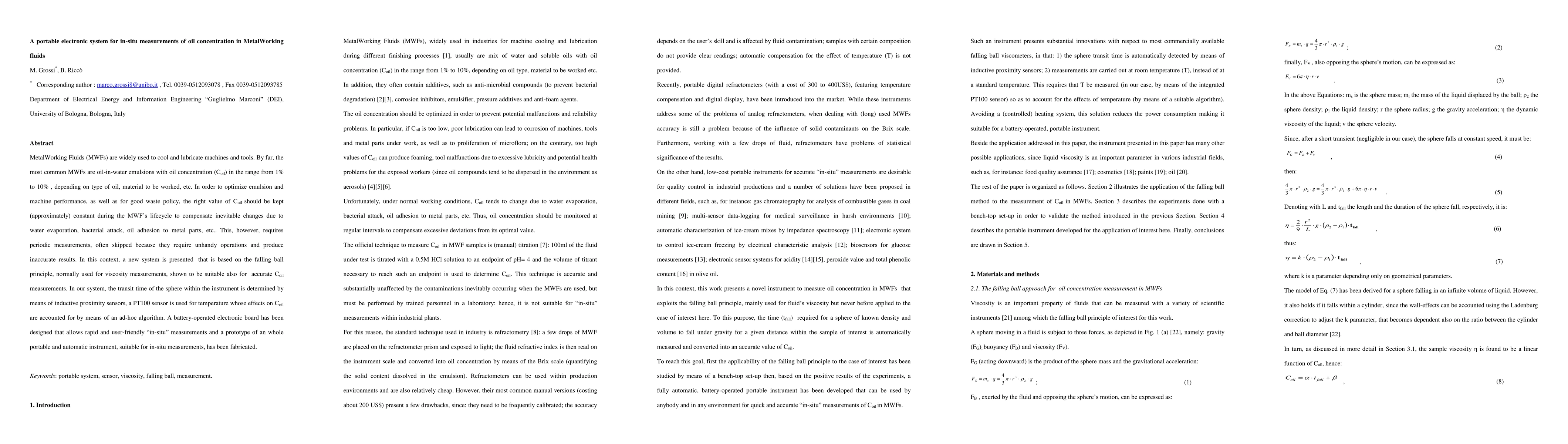 This paper presents a portable electronic system based on the falling ball principle for accurate in-situ measurements of oil concentration in MetalWorking fluids. The system uses inductive proximity sensors and a PT100 temperature sensor, with an algorithm to account for temperature effects, and is designed for rapid, user-friendly operation.