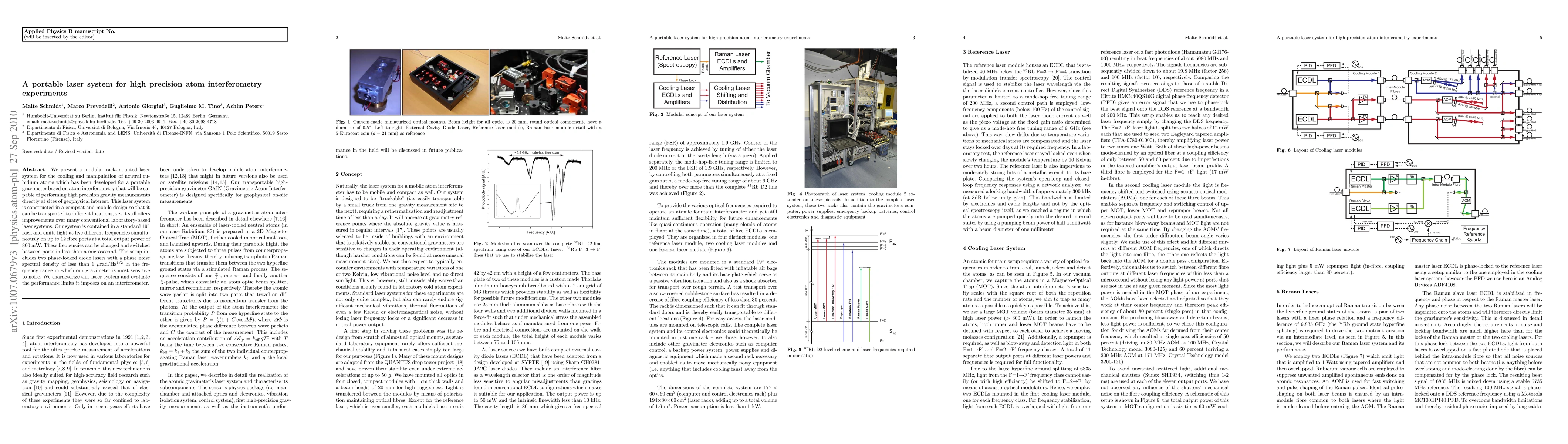 This paper describes a compact, modular laser system designed for high precision atom interferometry gravimetry, featuring five frequencies and up to 12 fiber ports, enabling transportable, high-precision gravity measurements at various geophysical sites. The system includes phase-locked diode lasers with low phase noise and evaluates its performance limits for interferometry.