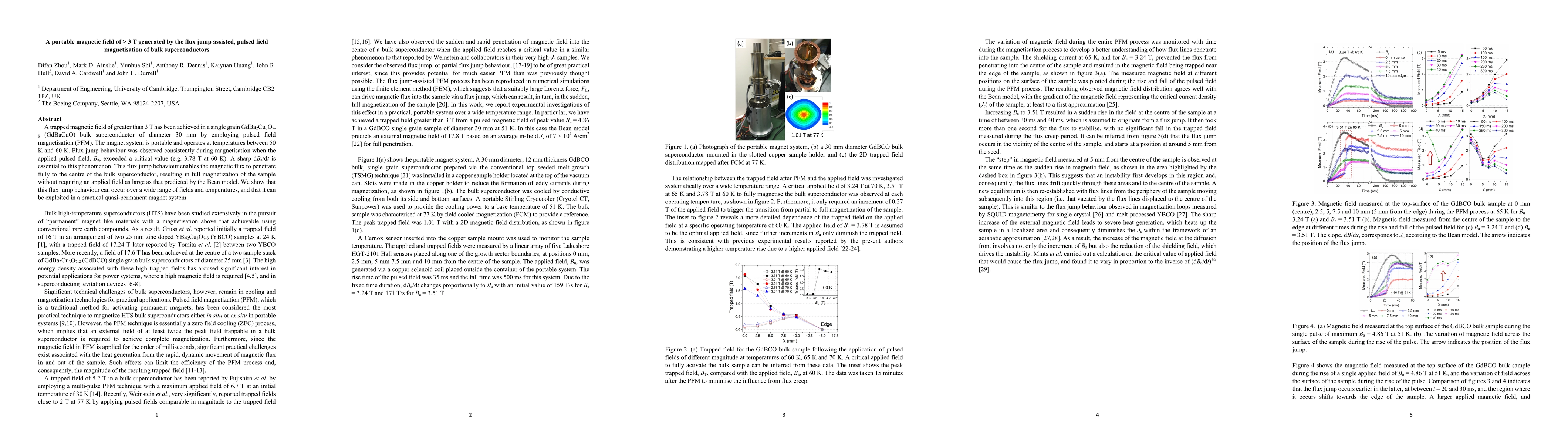 This paper reports the generation of a trapped magnetic field exceeding 3 T in a 30 mm diameter GdBaCuO bulk superconductor using pulsed field magnetisation, facilitated by a flux jump phenomenon. The portable magnet system operates efficiently at temperatures between 50 K and 60 K, enabling full magnetisation without requiring excessively large applied fields.