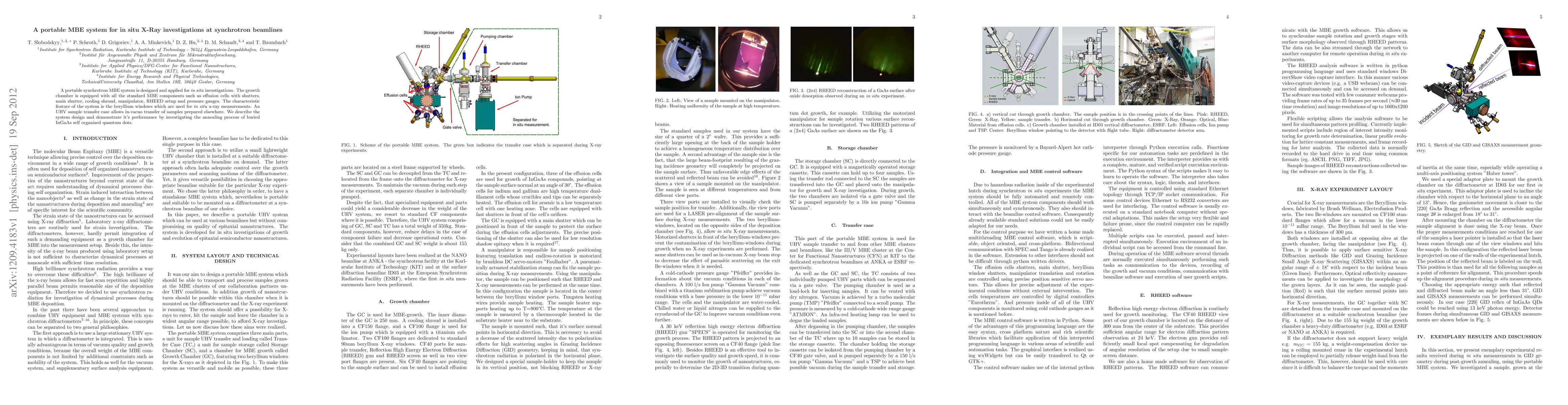 A portable synchrotron MBE system is designed and applied for in situ investigations. The growth chamber is equipped with all the standard MBE components such as effusion cells with shutters, main shutter, cooling shroud, manipulator, RHEED setup and pressure gauges. The characteristic feature of the system is the beryllium windows which are used for in situ x-ray measurements. An UHV sample transfer case allows in-vacuo transfer of samples prepared elsewhere. We describe the system design and demonstrate it's performance by investigating the annealing process of buried InGaAs self organized quantum dots.