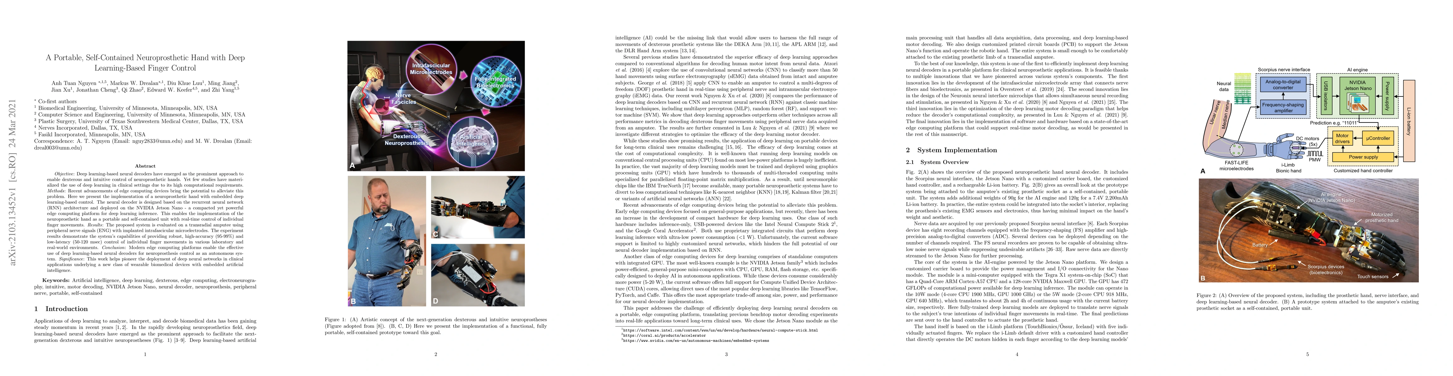 This paper presents a portable, self-contained neuroprosthetic hand utilizing deep learning-based neural decoders deployed on an edge computing platform for real-time control. The system achieves high accuracy and low latency, demonstrating its potential for clinical use in neuroprosthetic applications.