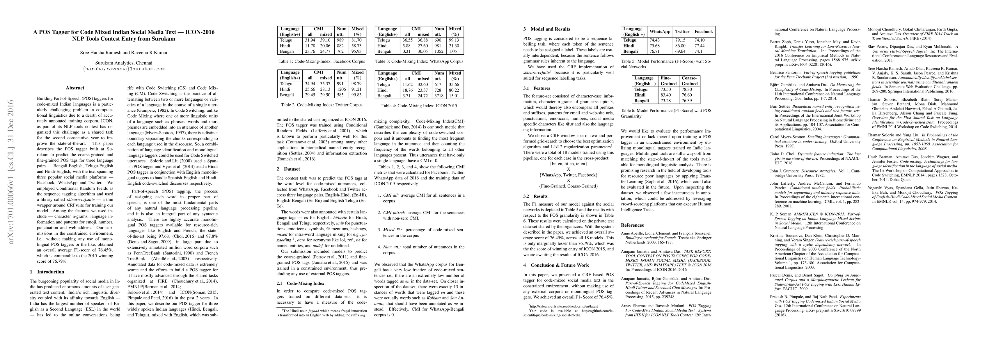 Building Part-of-Speech (POS) taggers for code-mixed Indian languages is a particularly challenging problem in computational linguistics due to a dearth of accurately annotated training corpora. ICON, as part of its NLP tools contest has organized this challenge as a shared task for the second consecutive year to improve the state-of-the-art. This paper describes the POS tagger built at Surukam to predict the coarse-grained and fine-grained POS tags for three language pairs - Bengali-English, Telugu-English and Hindi-English, with the text spanning three popular social media platforms - Facebook, WhatsApp and Twitter. We employed Conditional Random Fields as the sequence tagging algorithm and used a library called sklearn-crfsuite - a thin wrapper around CRFsuite for training our model. Among the features we used include - character n-grams, language information and patterns for emoji, number, punctuation and web-address. Our submissions in the constrained environment,i.e., without making any use of monolingual POS taggers or the like, obtained an overall average F1-score of 76.45%, which is comparable to the 2015 winning score of 76.79%.