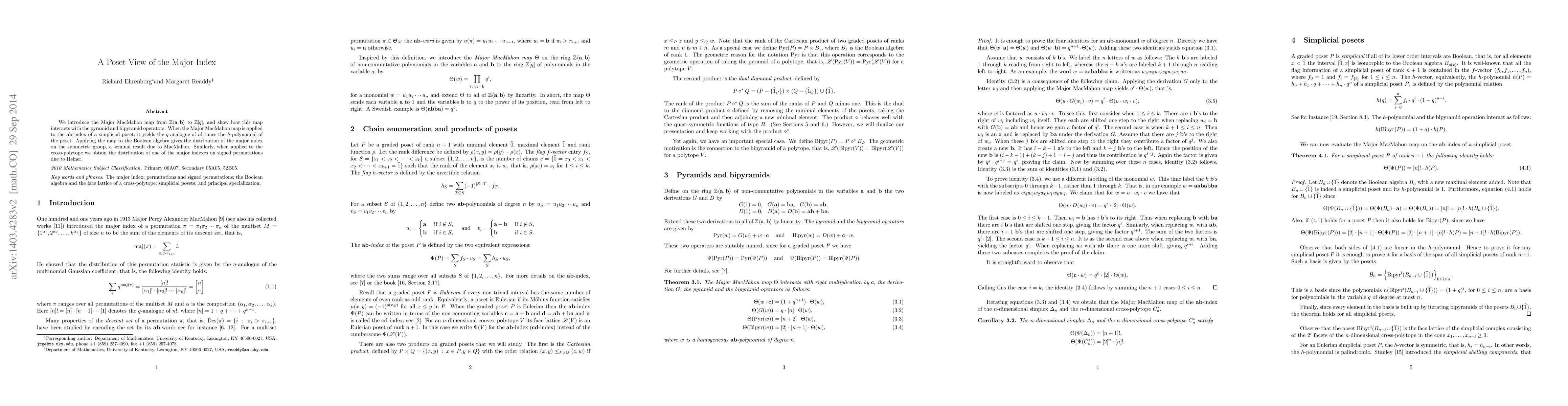 We introduce the Major MacMahon map and show how this map interacts with the pyramid and bipyramid operators. When the Major MacMahon map is applied to the ab-index of a simplicial poset, it yields the q-analogue of n! times the h-polynomial of the poset. Applying the map to the Boolean algebra gives the distribution of the major index on the symmetric group, a seminal result due to MacMahon. Similarly, when applied to the cross-polytope we obtain the distribution of one of the major indexes on signed permutations due to Reiner.