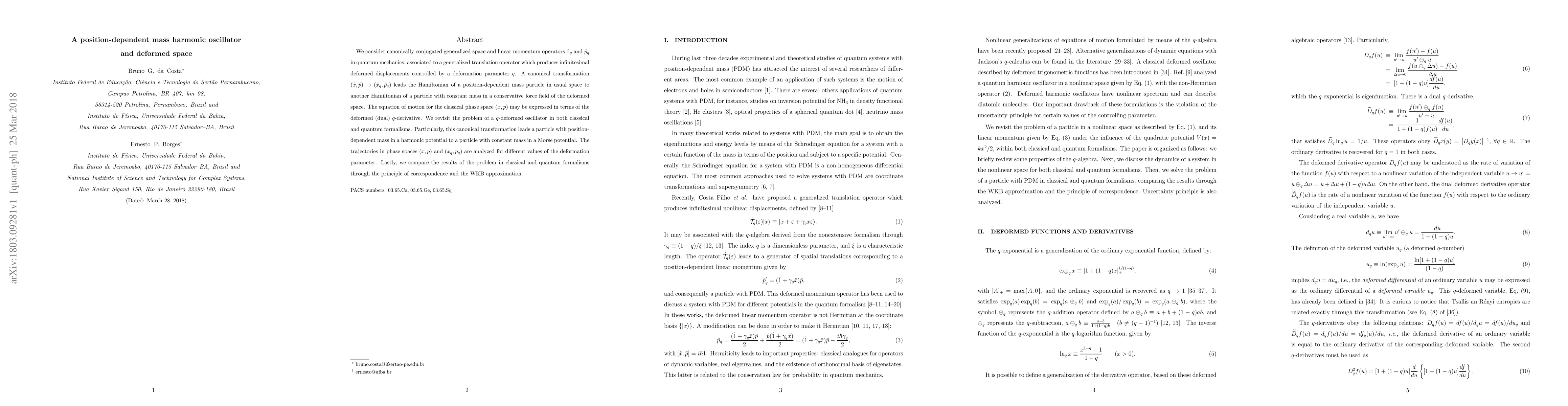 We consider canonically conjugated generalized space and linear momentum operators $\hat{x}_q$ and $ \hat{p}_q$ in quantum mechanics, associated to a generalized translation operator which produces infinitesimal deformed displacements controlled by a deformation parameter $q$. A canonical transformation $(\hat{x}, \hat{p}) \rightarrow (\hat{x}_q, \hat{p}_q)$ leads the Hamiltonian of a position-dependent mass particle in usual space to another Hamiltonian of a particle with constant mass in a conservative force field of the deformed space. The equation of motion for the classical phase space $(x, p)$ may be expressed in terms of the deformed (dual) $q$-derivative. We revisit the problem of a $q$-deformed oscillator in both classical and quantum formalisms. Particularly, this canonical transformation leads a particle with position-dependent mass in a harmonic potential to a particle with constant mass in a Morse potential. The trajectories in phase spaces $(x,p)$ and $(x_q, p_q)$ are analyzed for different values of the deformation parameter. Lastly, we compare the results of the problem in classical and quantum formalisms through the principle of correspondence and the WKB approximation.