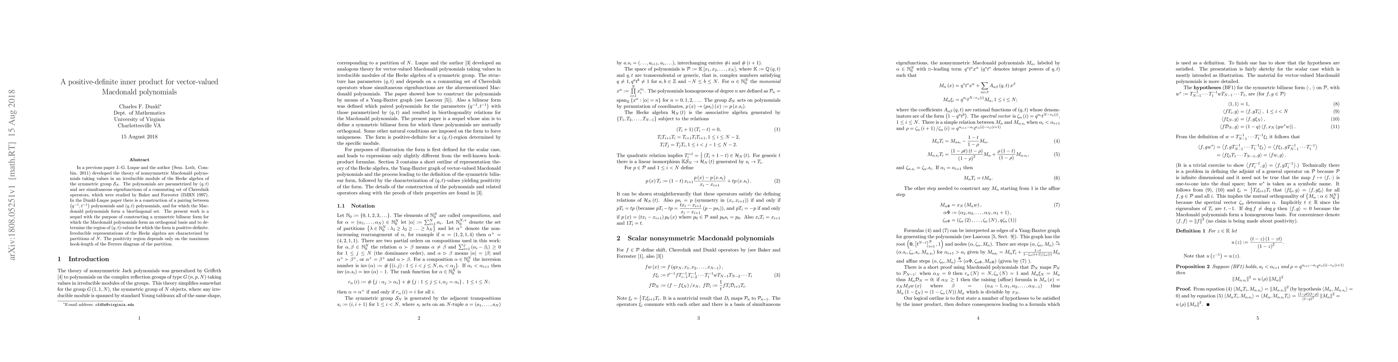 In a previous paper J.-G. Luque and the author (Sem. Loth. Combin. 2011) developed the theory of nonsymmetric Macdonald polynomials taking values in an irreducible module of the Hecke algebra of the symmetric group $\mathcal{S}_{N}$. The polynomials are parametrized by $\left( q,t\right) $ and are simultaneous eigenfunctions of a commuting set of Cherednik operators, which were studied by Baker and Forrester (IMRN 1997). In the Dunkl-Luque paper there is a construction of a pairing between $\left( q^{-1},t^{-1}\right) $ polynomials and $\left( q,t\right) $ polynomials, and for which the Macdonald polynomials form a biorthogonal set. The present work is a sequel with the purpose of constructing a symmetric bilinear form for which the Macdonald polynomials form an orthogonal basis and to determine the region of $\left( q,t\right) $-values for which the form is positive-definite. Irreducible representations of the Hecke algebra are characterized by partitions of $N$. The positivity region depends only on the maximum hook-length of the Ferrers diagram of the partition.