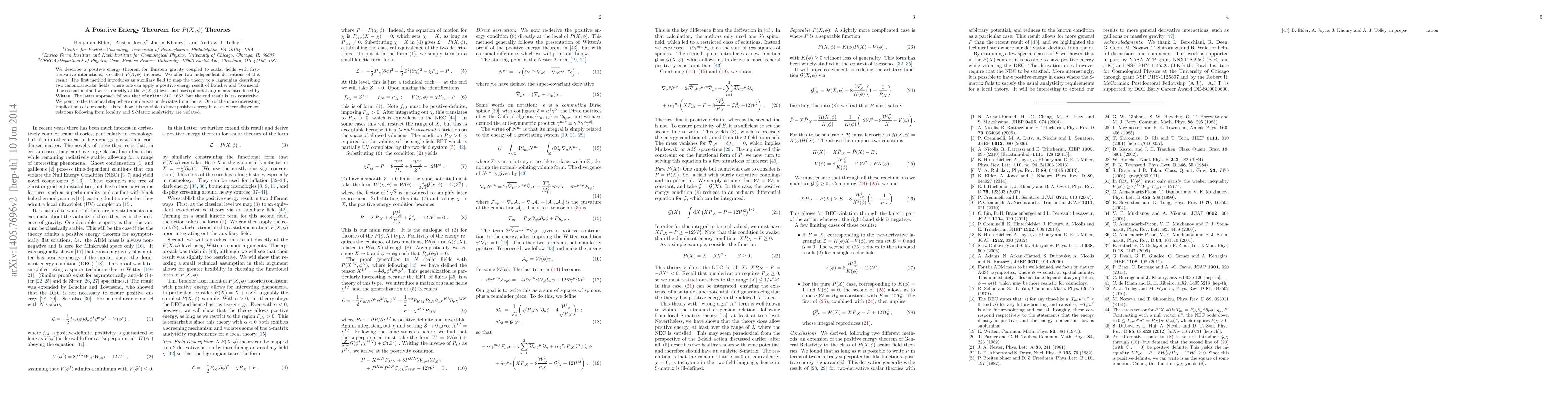 We describe a positive energy theorem for Einstein gravity coupled to scalar fields with first-derivative interactions, so-called P(X,phi) theories. We offer two independent derivations of this result. The first method introduces an auxiliary field to map the theory to a lagrangian describing two canonical scalar fields, where one can apply a positive energy result of Boucher and Townsend. The second method works directly at the P(X,phi) level and uses spinorial arguments introduced by Witten. The latter approach follows that of arXiv:1310.1663, but the end result is less restrictive. We point to the technical step where our derivation deviates from theirs. One of the more interesting implications of our analysis is to show it is possible to have positive energy in cases where dispersion relations following from locality and S-Matrix analyticity are violated.