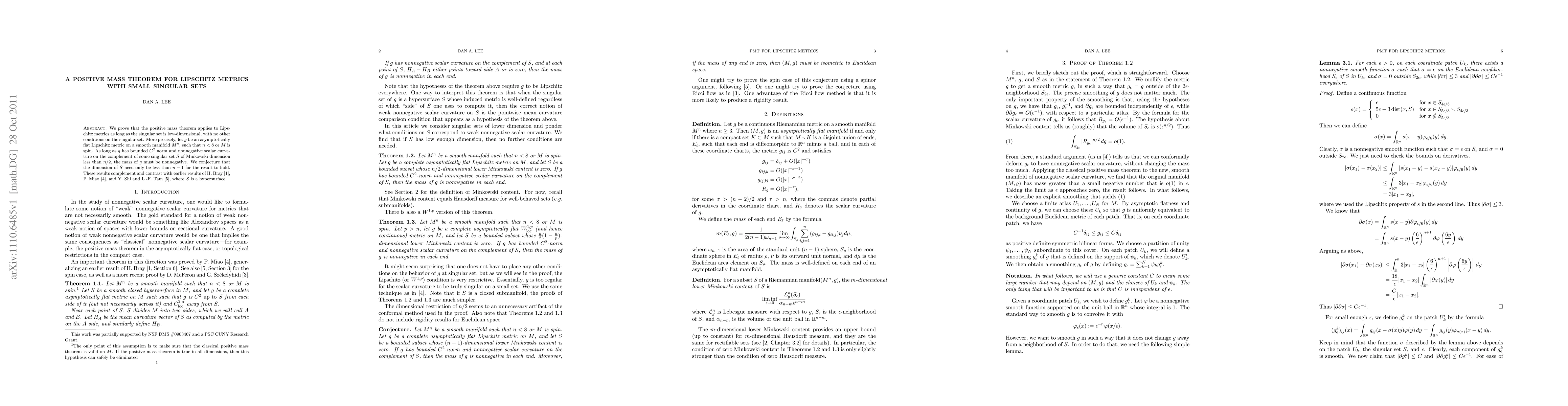 We prove that the positive mass theorem applies to Lipschitz metrics as long as the singular set is low-dimensional, with no other conditions on the singular set. More precisely, let $g$ be an asymptotically flat Lipschitz metric on a smooth manifold $M^n$, such that $n<8$ or $M$ is spin. As long as $g$ has bounded $C^2$ norm and nonnegative scalar curvature on the complement of some singular set $S$ of Minkowski dimension less than $n/2$, the mass of $g$ must be nonnegative. We conjecture that the dimension of $S$ need only be less than $n-1$ for the result to hold. These results complement and contrast with earlier results of H. Bray, P. Miao, and Y. Shi and L.-F. Tam, where $S$ is a hypersurface.