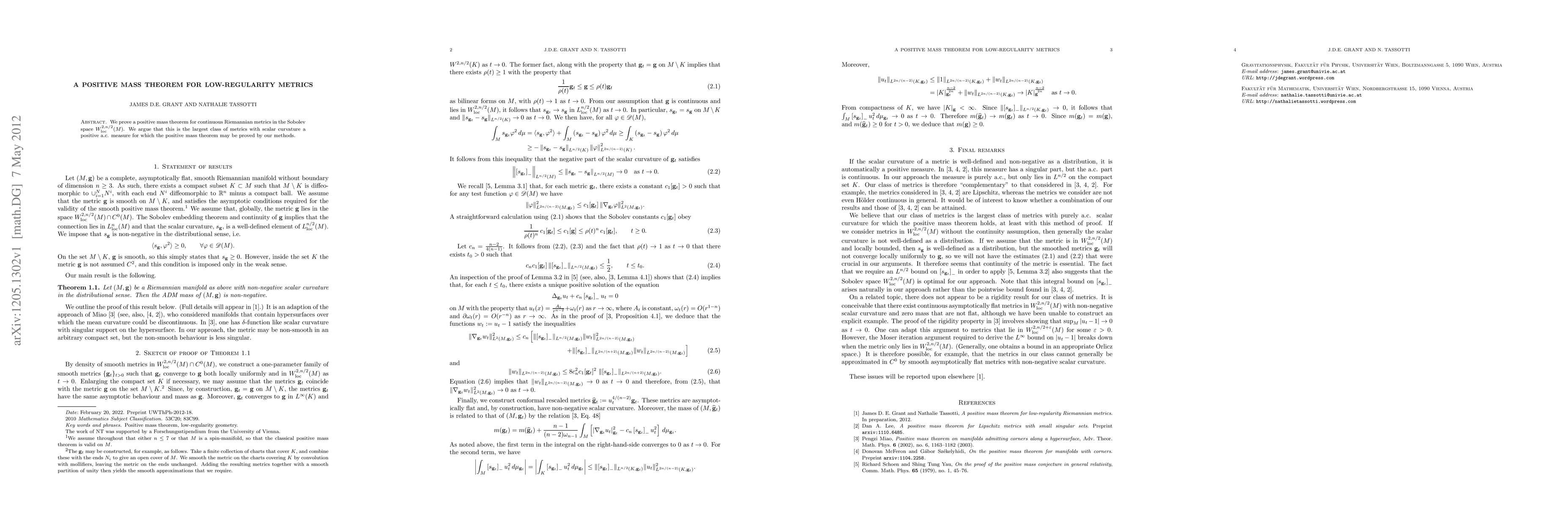 We prove a positive mass theorem for continuous Riemannian metrics in the Sobolev space $W^{2, n/2}_{\mathrm{loc}}(M)$. We argue that this is the largest class of metrics with scalar curvature a positive a.c. measure for which the positive mass theorem may be proved by our methods.