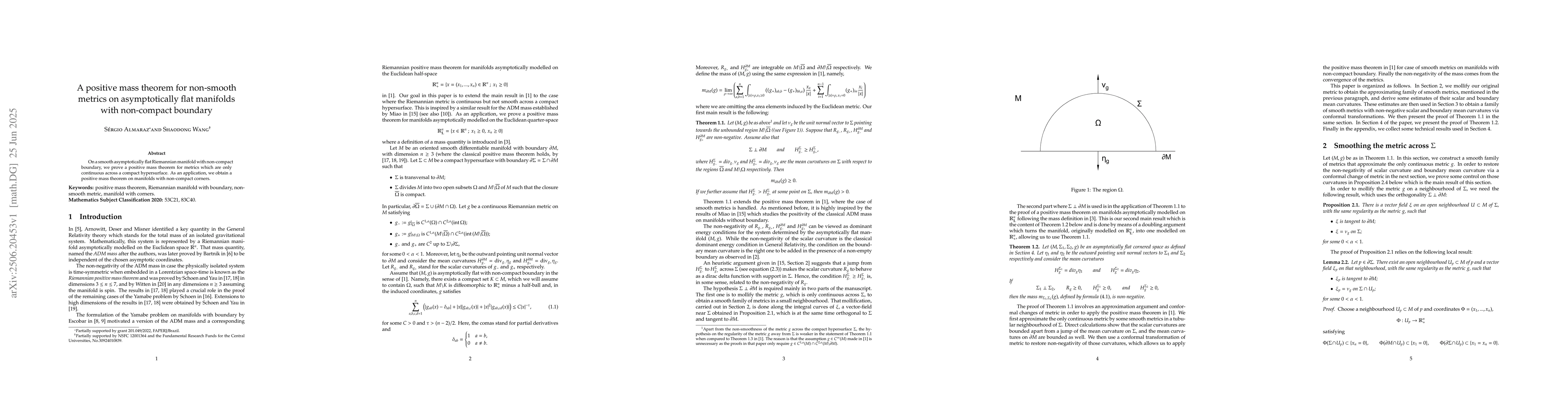 On a smooth asymptotically flat Riemannian manifold with non-compact boundary, we prove a positive mass theorem for metrics which are only continuous across a compact hypersurface. As an application, we obtain a positive mass theorem on manifolds with non-compact corners.