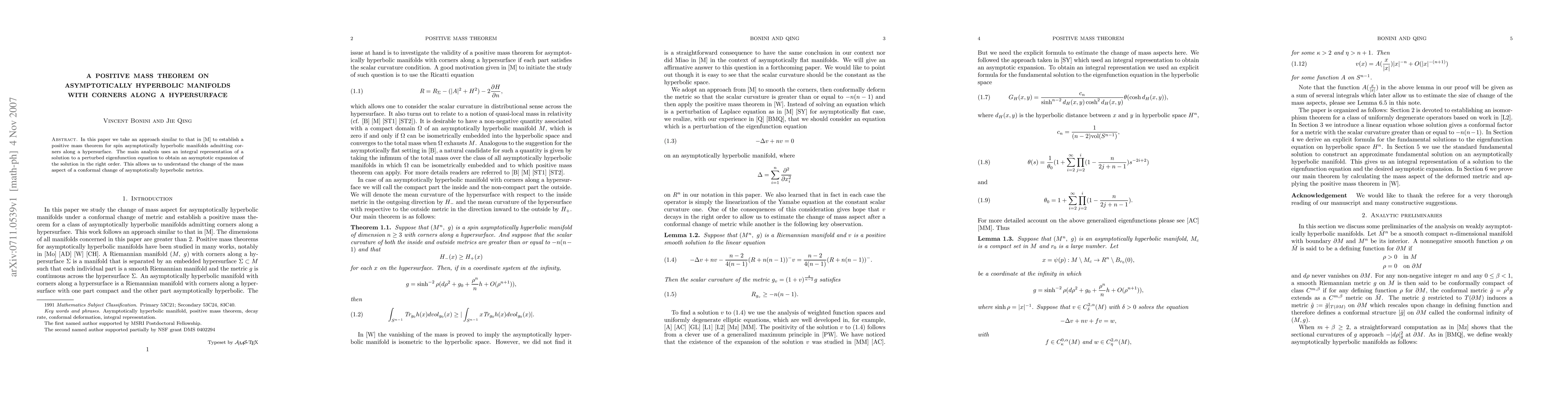 This paper establishes a positive mass theorem for asymptotically hyperbolic spin manifolds with corners along a hypersurface, using an integral representation of perturbed eigenfunction solutions to derive an asymptotic expansion and understand the mass change under conformal metric transformations.