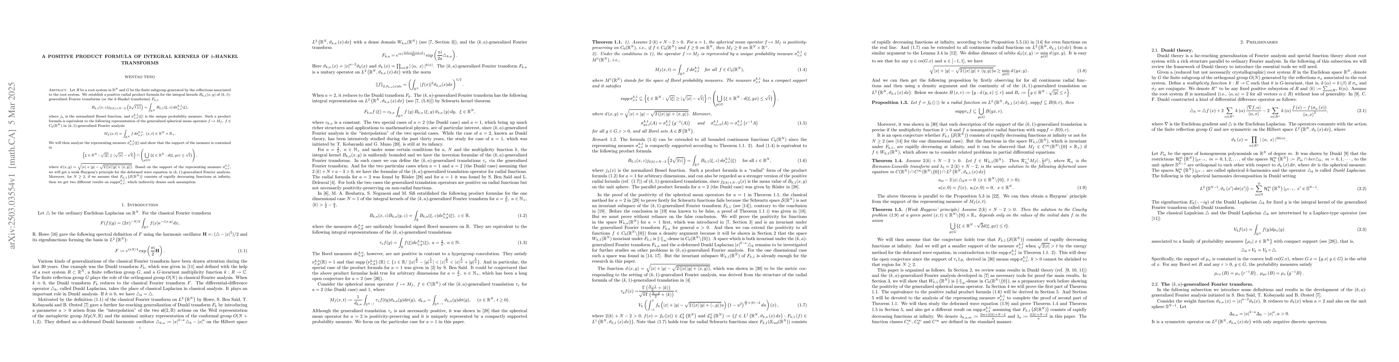 The research establishes a positive radial product formula for integral kernels of (k,1)-generalized Fourier transforms (k-Hankel transforms) using root systems and finite subgroups generated by reflections.