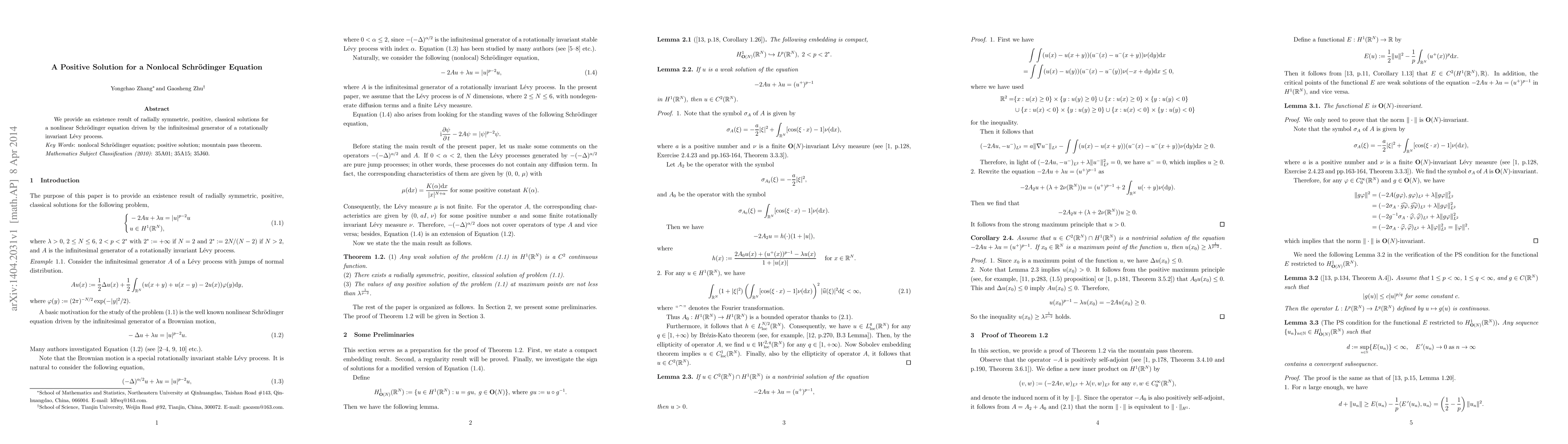 Summary: This paper establishes the existence of radially symmetric, positive classical solutions for a nonlinear Schrödinger equation influenced by the infinitesimal generator of a rotationally invariant Lévy process. The solutions are shown to be positive and classical under specified conditions.
