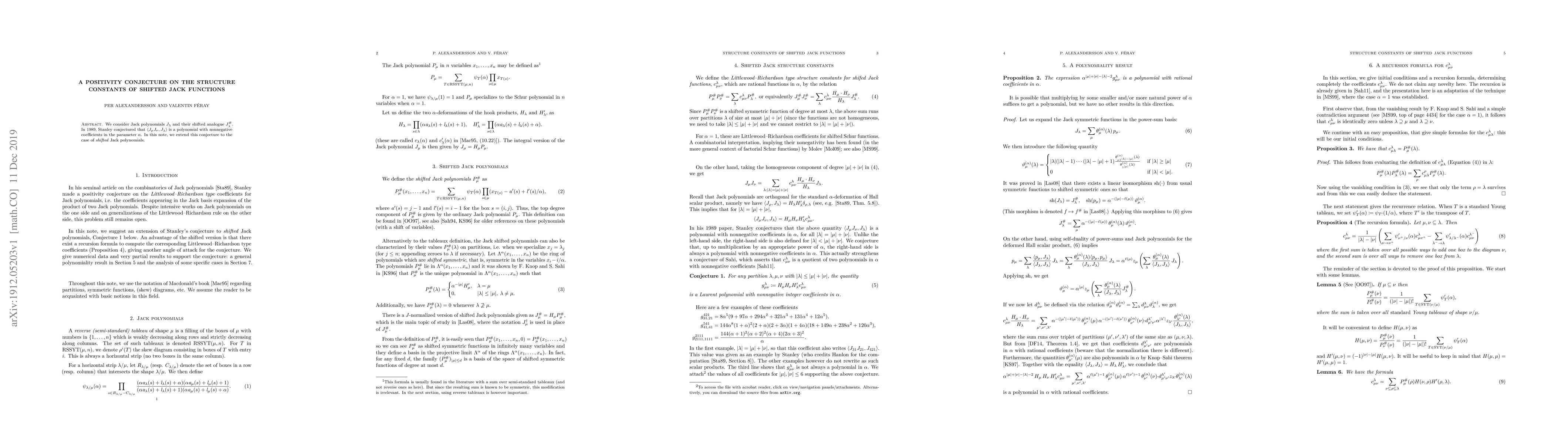 This paper extends Stanley's 1989 conjecture on the positivity of structure constants for Jack polynomials to their shifted analogues, proposing that the inner product $\langle J^#_\mu J^#_\nu, J^#_\lambda \rangle$ has nonnegative coefficients in the parameter $\alpha$.
