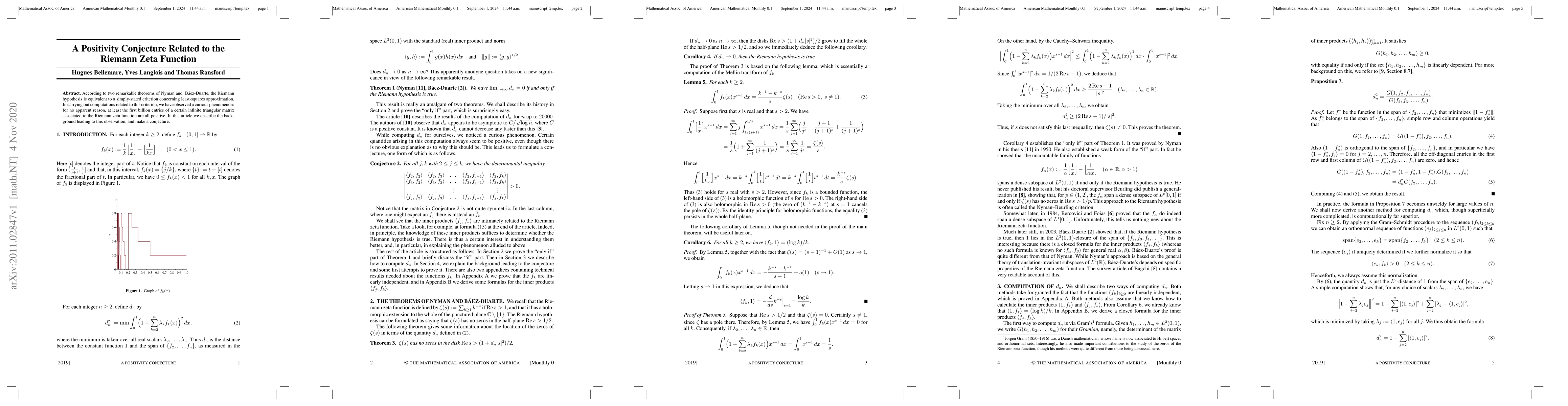 According to two remarkable theorems of Nyman and B\'aez-Duarte, the Riemann hypothesis is equivalent to a simply-stated criterion concerning least-squares approximation. In carrying out computations related to this criterion, we have observed a curious phenomenon: for no apparent reason, at least the first billion entries of a certain infinite triangular matrix associated to the Riemann zeta function are all positive. In this article we describe the background leading to this observation, and make a conjecture.