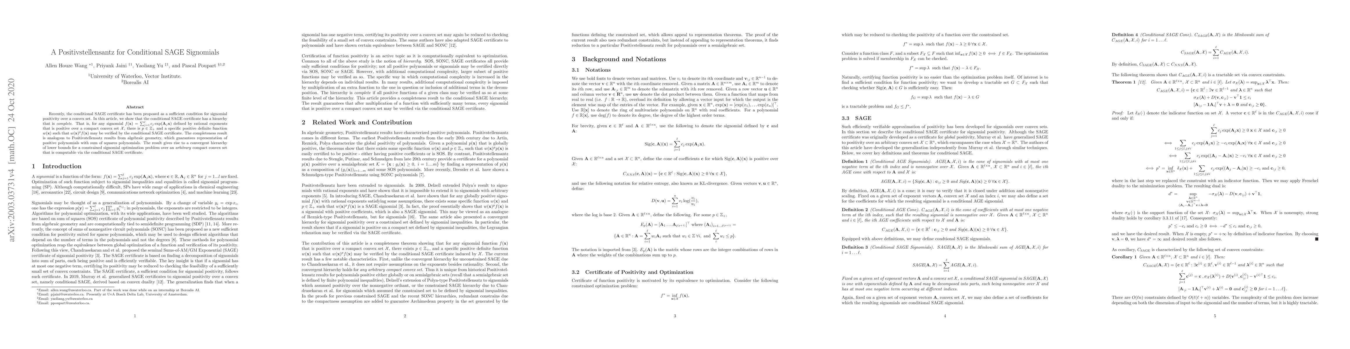 This research paper proves the completeness of the conditional SAGE certificate for signomial positivity over compact convex sets, similar to Positivstellensatz results in algebraic geometry. This leads to a convergent hierarchy of lower bounds for constrained signomial optimization over arbitrary compact convex sets, computable via the conditional SAGE certificate.