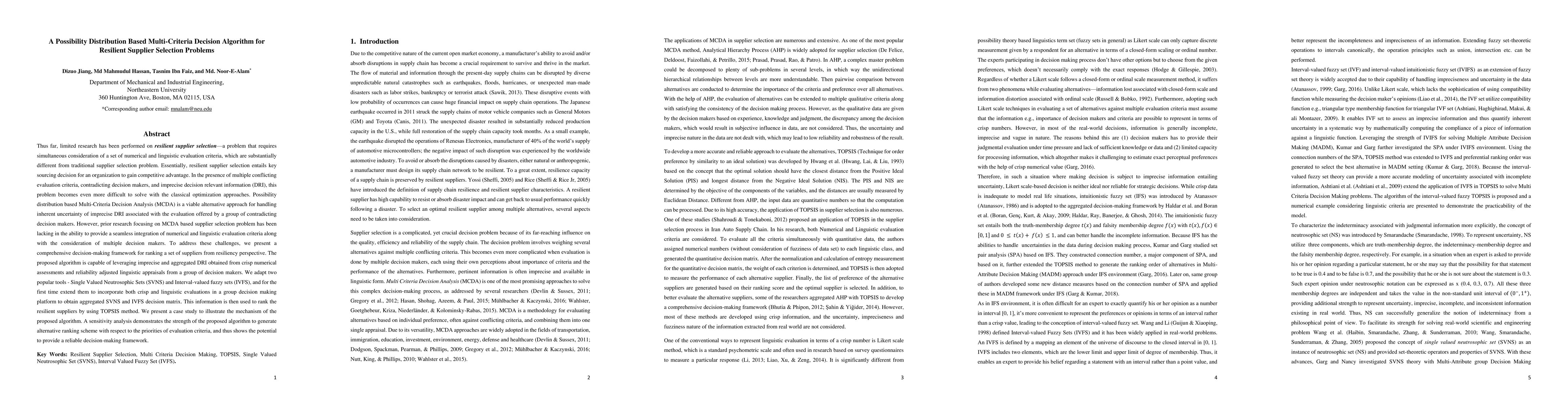 This paper proposes a multi-criteria decision-making algorithm for resilient supplier selection, integrating numerical and linguistic criteria using Single Valued Neutrosophic Sets and Interval-valued fuzzy sets. The TOPSIS method is applied to rank suppliers based on aggregated imprecise decision-relevant information from multiple decision makers.