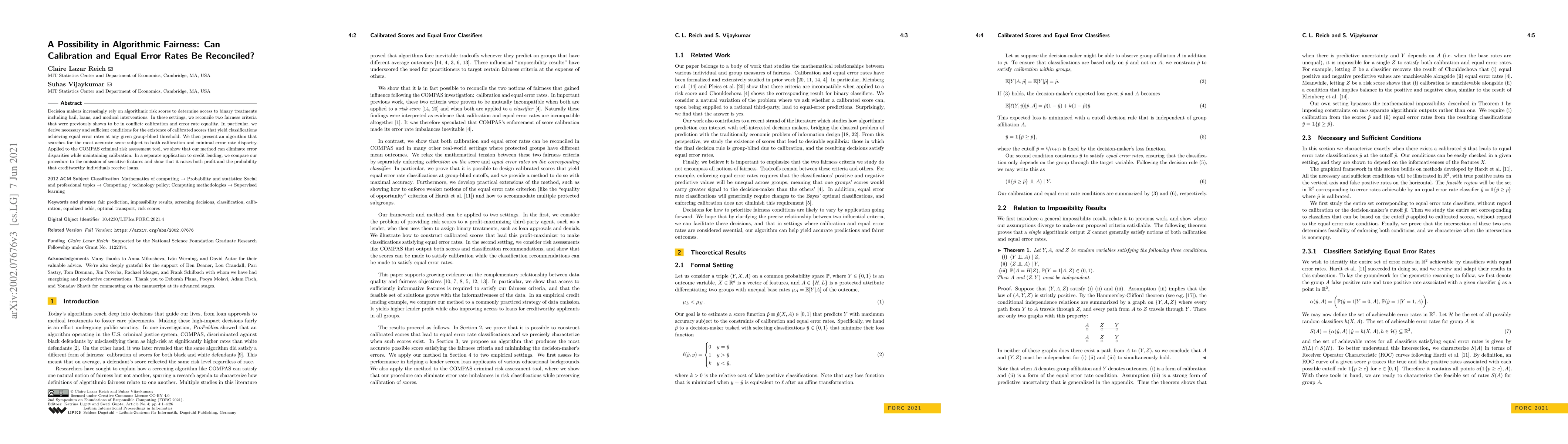 This paper explores reconciling calibration and equal error rates in algorithmic fairness, deriving conditions for their coexistence and presenting an algorithm that achieves both. Applied to COMPAS and credit lending, the method eliminates error disparities and improves outcomes compared to omitting sensitive features.