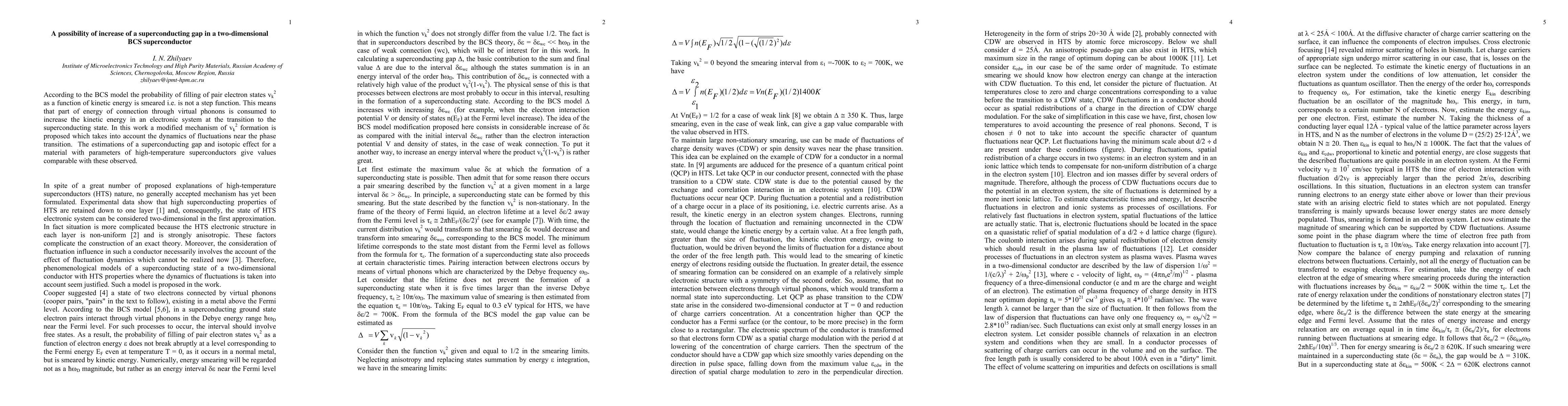 According to the BCS model the probability of filling of pair electron states vk2 as a function of kinetic energy is smeared i.e. is not a step function. This means that part of energy of connection through virtual phonons is consumed to increase the kinetic energy in an electron system at the transition to the superconducting state. In this work a modified mechanism of vk2 formation is proposed which takes into account the dynamics of fluctuations near the phase transition. The estimations of superconducting gap and isotopic effect for a matrial with parameters of high-temperature superconductors give values comparable with these observed