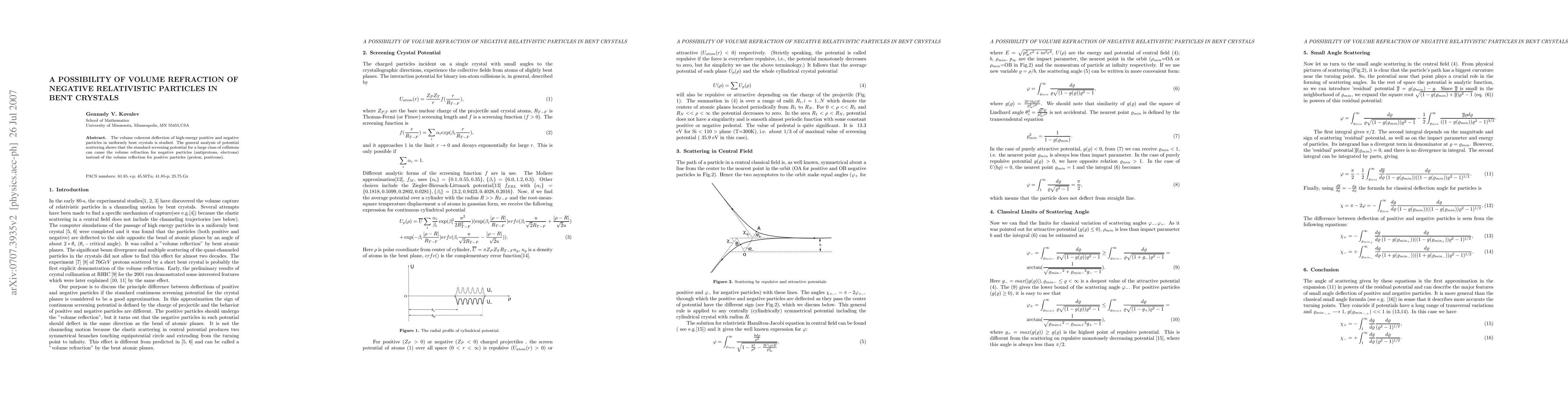 Summary: This study investigates the coherent deflection of high-energy particles in bent crystals, revealing that negative relativistic particles (antiprotons, electrons) experience volume refraction rather than reflection, unlike their positive counterparts (protons, positrons), due to the standard screening potential.