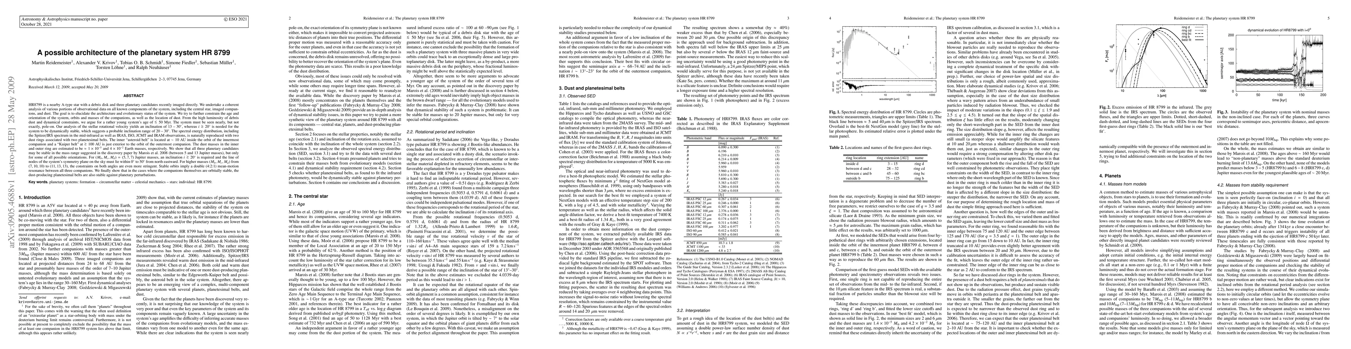 This research analyzes the architecture of the HR 8799 planetary system, revealing it to be a young (<50Myr) system with an inclination of 20-30deg. The system includes two dust rings corresponding to planetesimal belts and three stable planetary candidates in a 4:2:1 mean-motion resonance.