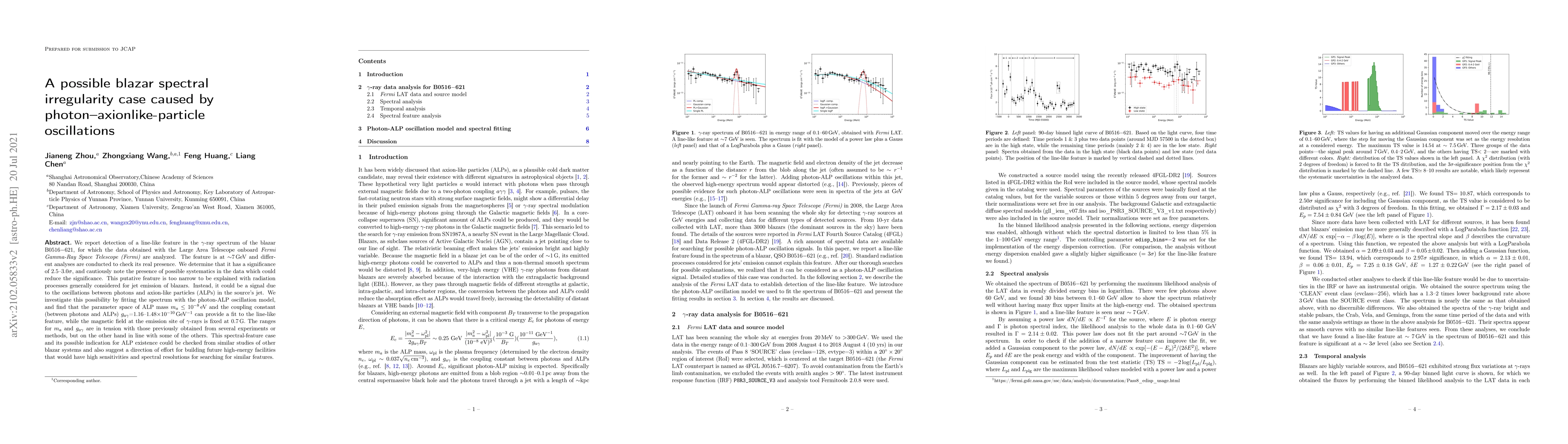 Researchers detected a line-like feature in the gamma-ray spectrum of blazar B0516-621, suggesting photon-axionlike-particle oscillations as a possible explanation. The analysis found a narrow signal at 7 GeV with a significance of 2.5-3 sigma.