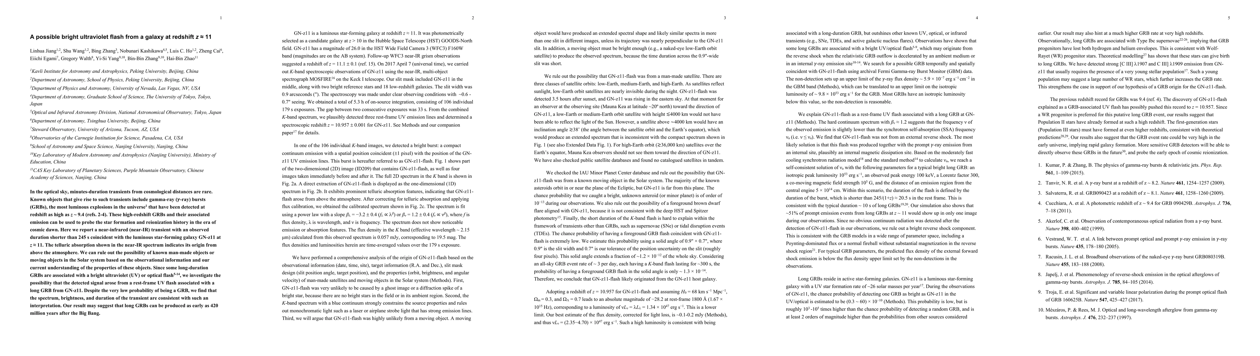 This paper reports a brief near-infrared transient detected near the galaxy GN-z11 at redshift z ~ 11, suggesting a possible bright ultraviolet flash potentially linked to a long-duration gamma-ray burst, indicating that such cosmic events could occur as early as 420 million years post-Big Bang.
