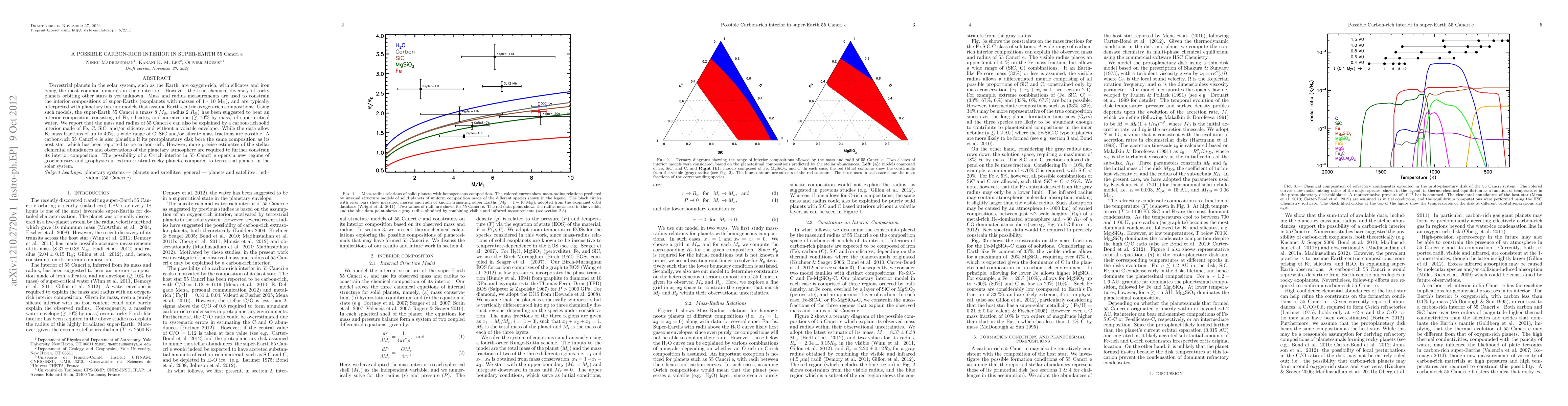 The super-Earth 55 Cancri e may possess a carbon-rich interior composed of Fe, C, SiC, and/or silicates, challenging the assumption of an oxygen-rich interior typical of terrestrial planets. Further precise stellar abundances and atmospheric observations are needed to confirm this unconventional composition.