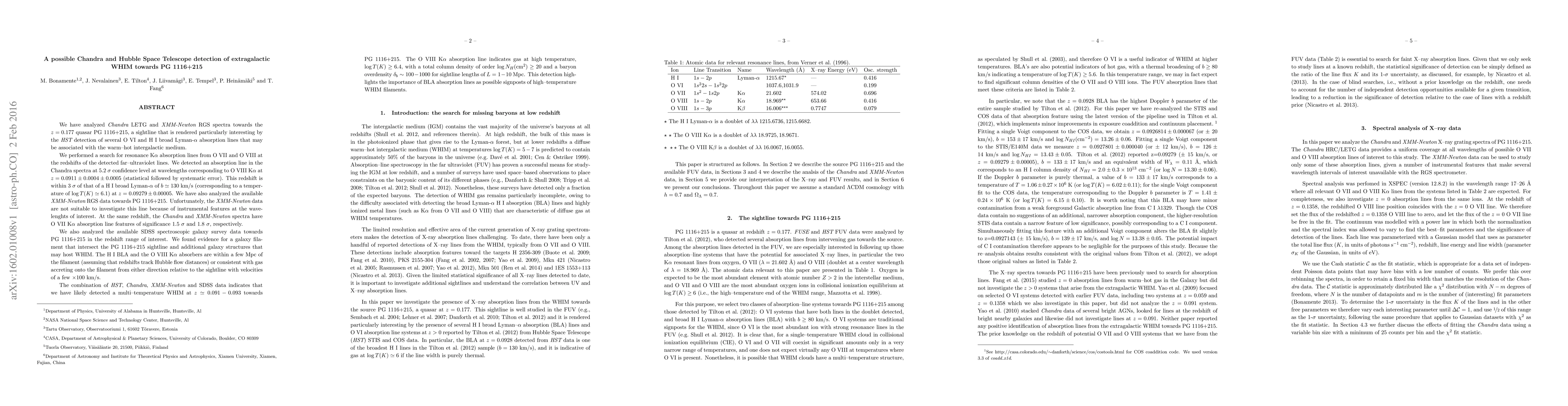 (Abridged) We have analyzed Chandra LETG and XMM-Newton RGS spectra towards the z=0.177 quasar PG 1116+215, a sightline that is rendered particularly interesting by the HST detection of several OVI and HI broad Lyman-alpha absorption lines that may be associated with the warm-hot intergalactic medium. We performed a search for resonance K-alpha absorption lines from OVII and OVIII at the redshifts of the detected far-ultraviolet lines. We detected an absorption line in the Chandra spectra at 5.2 sigma confidence level at wavelengths corresponding to OVIII K-alpha at z=0.0911+-0.0004+-0.0005 (statistical followed by systematic error). This redshift is within 3 sigma of that of a HI broad Lyman-alpha of b=130 km/s at z=0.09279+-0.00005. We have also analyzed the available XMM-Newton RGS data towards PG 1116+215. Unfortunately, the XMM-Newton data are not suitable to investigate this line because of instrumental features at the wavelengths of interest. At the same redshift, the Chandra and XMM-Newton spectra have OVII K-alpha absorption line features of significance 1.5 sigma and 1.8 sigma, respectively. We also analyzed the available SDSS spectroscopic galaxy survey data towards PG 1116+215 in the redshift range of interest. We found evidence for a galaxy filament that intersects the PG 1116+215 sightline and additional galaxy structures that may host WHIM. The combination of HST, Chandra, XMM-Newton and SDSS data indicates that we have likely detected a multi-temperature WHIM at z=0.091-0.093 towards PG 1116+215.