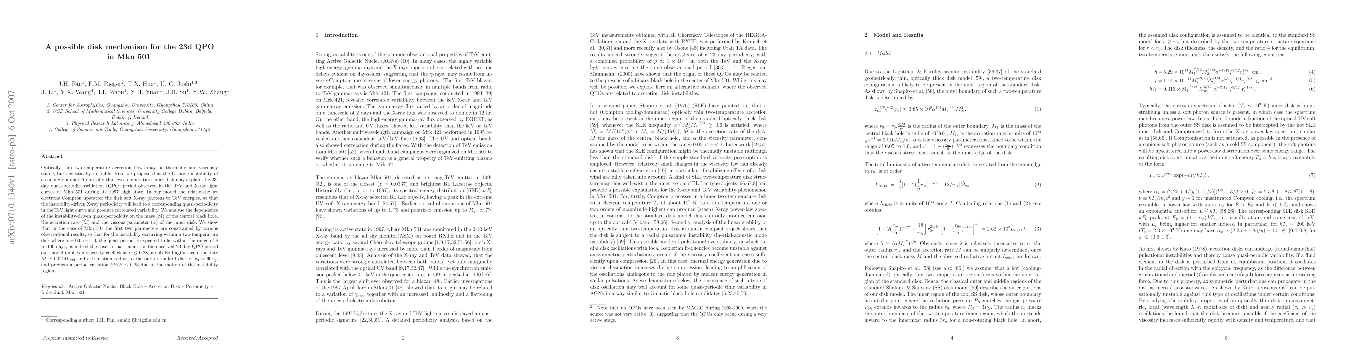 Optically thin two-temperature accretion flows may be thermally and viscously stable, but acoustically unstable. Here we propose that the O-mode instability of a cooling-dominated optically thin two-temperature inner disk may explain the 23-day quasi-periodic oscillation (QPO) period observed in the TeV and X-ray light curves of Mkn~501 during its 1997 high state. In our model the relativistic jet electrons Compton upscatter the disk soft X-ray photons to TeV energies, so that the instability-driven X-ray periodicity will lead to a corresponding quasi-periodicity in the TeV light curve and produce correlated variability. We analyse the dependence of the instability-driven quasi-periodicity on the mass (M) of the central black hole, the accretion rate ($\rm{\dot{M}}$) and the viscous parameter ($\alpha$) of the inner disk. We show that in the case of Mkn~501 the first two parameters are constrained by various observational results, so that for the instability occurring within a two-temperature disk where $\alpha=0.05-1.0$, the quasi-period is expected to lie within the range of 8 to 100 days, as indeed the case. In particular, for the observed 23-day QPO period our model implies a viscosity coefficient $\alpha \leq 0.28$, a sub-Eddington accretion rate $\dot{M} \simeq 0.02 \dot{M}_{\rm Edd}$ and a transition radius to the outer standard disk of $r_0 \sim 60 r_g$, and predicts a period variation $\delta P/P \sim 0.23$ due to the motion of the instability region.