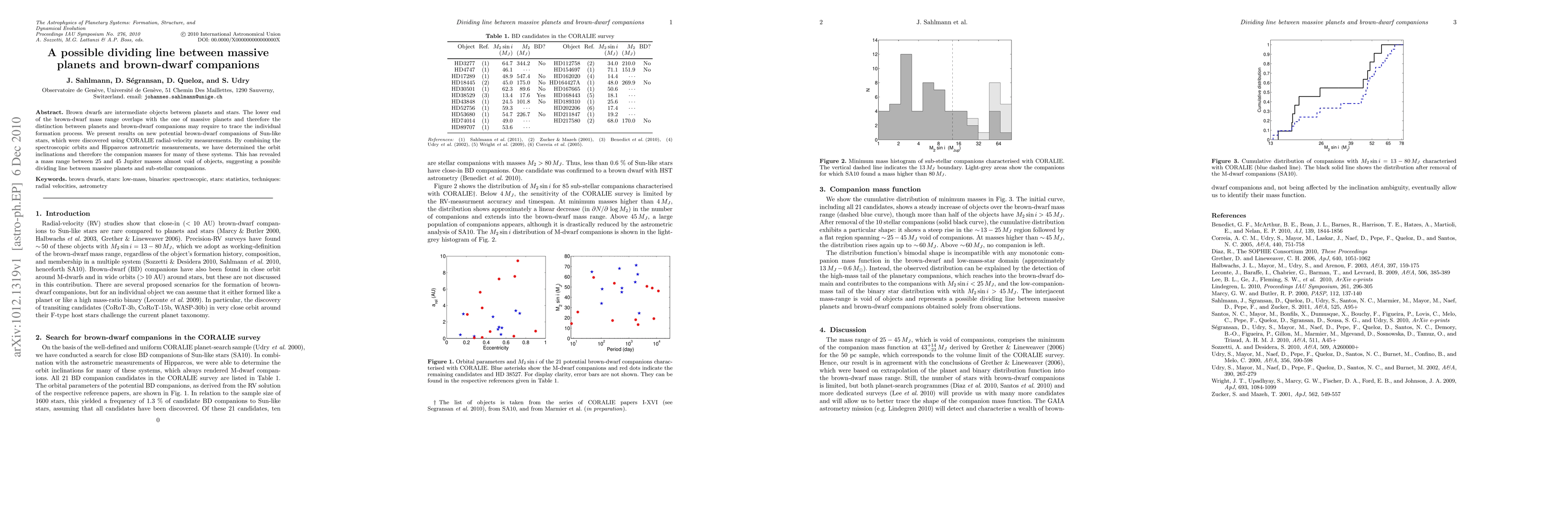 This study identifies a mass gap between 25 and 45 Jupiter masses in brown-dwarf companions to Sun-like stars, suggesting a potential dividing line between massive planets and sub-stellar objects. The findings are based on radial-velocity measurements and astrometric data, revealing a significant absence of objects in this mass range.
