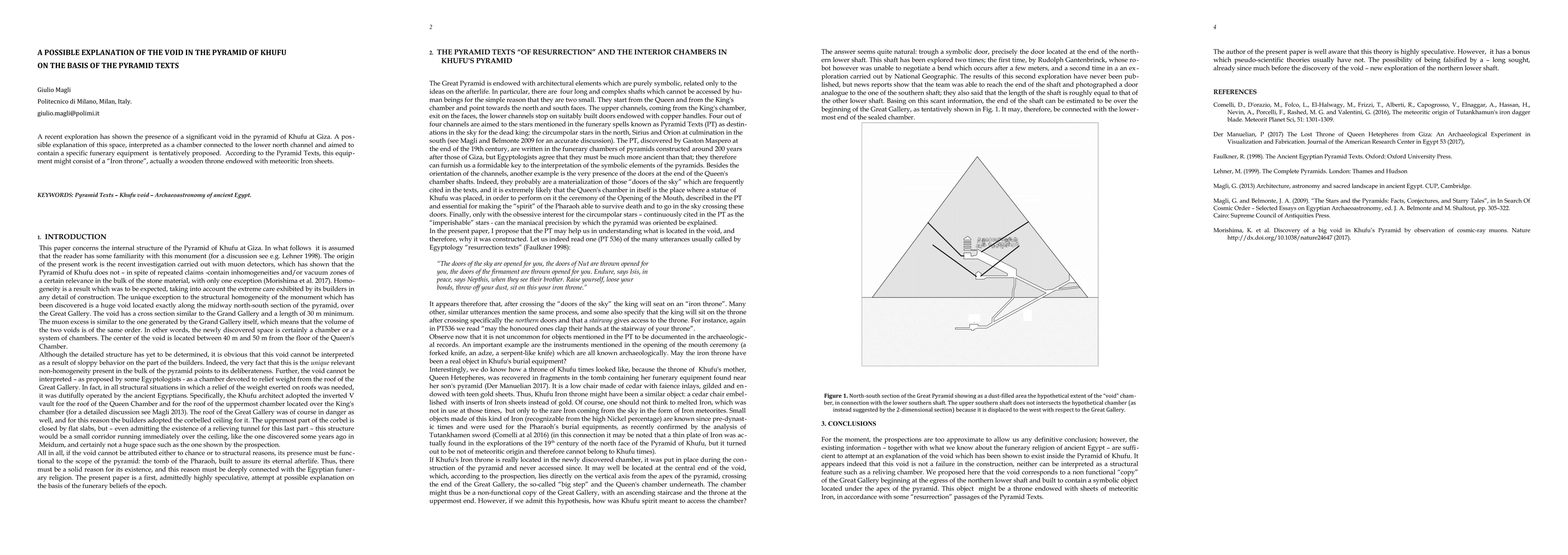 A recent exploration has shown the presence of a significant void in the pyramid of Khufu at Giza. A possible explanation of this space, interpreted as a chamber connected to the lower north channel and aimed to contain a specific funerary equipment is tentatively proposed. According to the Pyramid Texts, this equipment might consist of a Iron throne, actually a wooden throne endowed with meteoritic Iron sheets.
