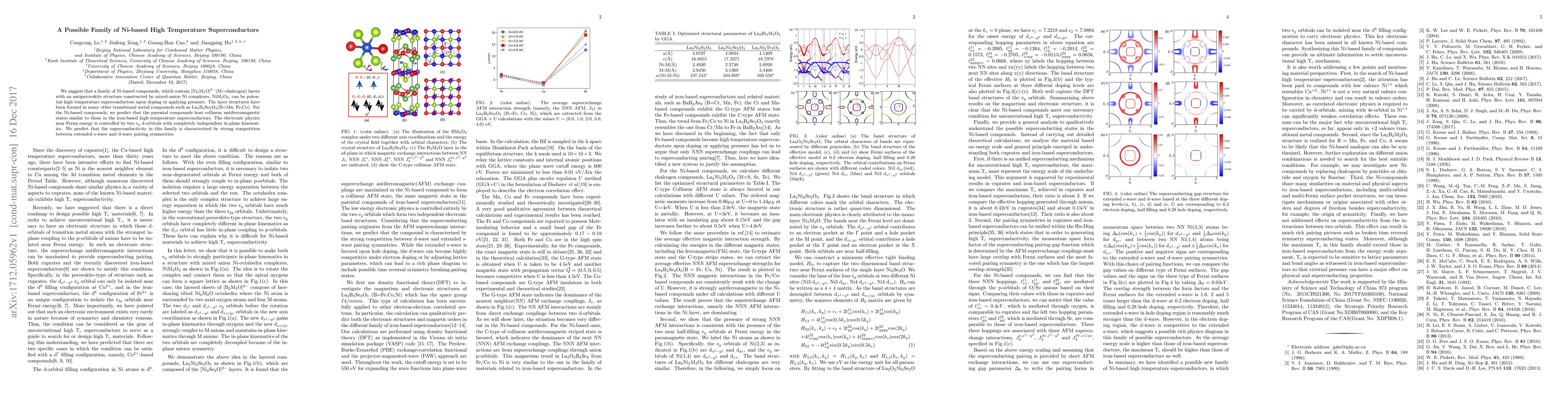 We suggest that a family of Ni-based compounds, which contain [Ni$_2$M$_2$O]$^{2-}$(M=chalcogen) layers with an antiperovskite structure constructed by mixed-anion Ni complexes, NiM$_4$O$_2$, can be potential high temperature superconductors upon doping or applying pressure. The layer structures have been formed in many other transitional metal compounds such as La$_2$B$_2$Se$_2$O$_3$(B=Mn, Fe,Co). For the Ni-based compounds, we predict that the parental compounds host collinear antiferromagnetic states similar to those in the iron-based high temperature superconductors. The electronic physics near Fermi energy is controlled by two e$_{g}$ d-orbitals with completely independent in-plane kinematics. We predict that the superconductivity in this family is characterized by strong competition between extended s-wave and d-wave pairing symmetries.