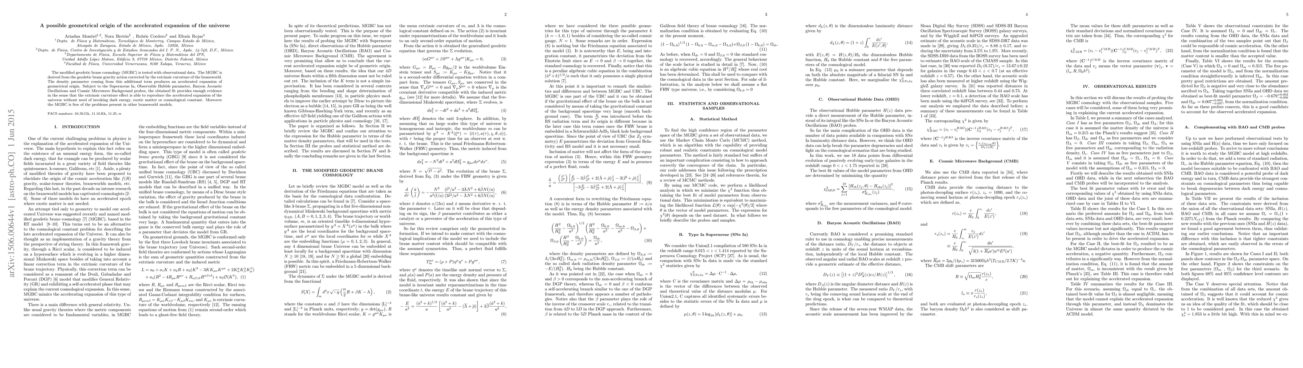 This paper tests modified geodetic brane cosmology (MGBC) to explain the universe's accelerated expansion, deriving it from geodetic brane gravity with an extrinsic curvature correction. Observational data from Supernovae Ia, Hubble parameter, Baryon Acoustic Oscillations, and Cosmic Microwave Background support MGBC's ability to reproduce this expansion without dark energy or a cosmological constant.