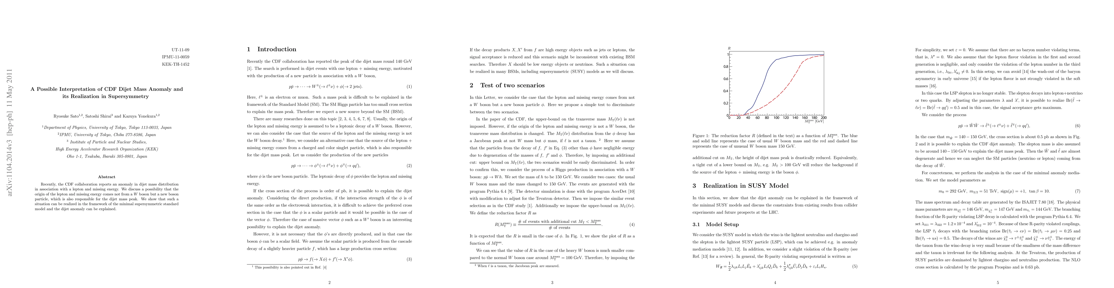 Recently, the CDF collaboration reports an anomaly in dijet mass distribution in association with a lepton and missing energy. We discuss a possibility that the origin of the lepton and missing energy comes not from a W boson but a new boson particle, which is also responsible for the dijet mass peak. We show that such a situation can be realized in the framework of the minimal supersymmetric standard model and the dijet anomaly can be explained.